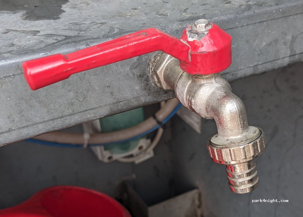 Wir haben den Schlauchanschluss heruntergedreht und unseren Gardena-Anschluss draufgedreht. Guter Wasserdruck, alles top.