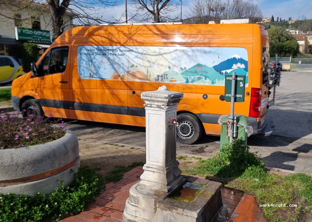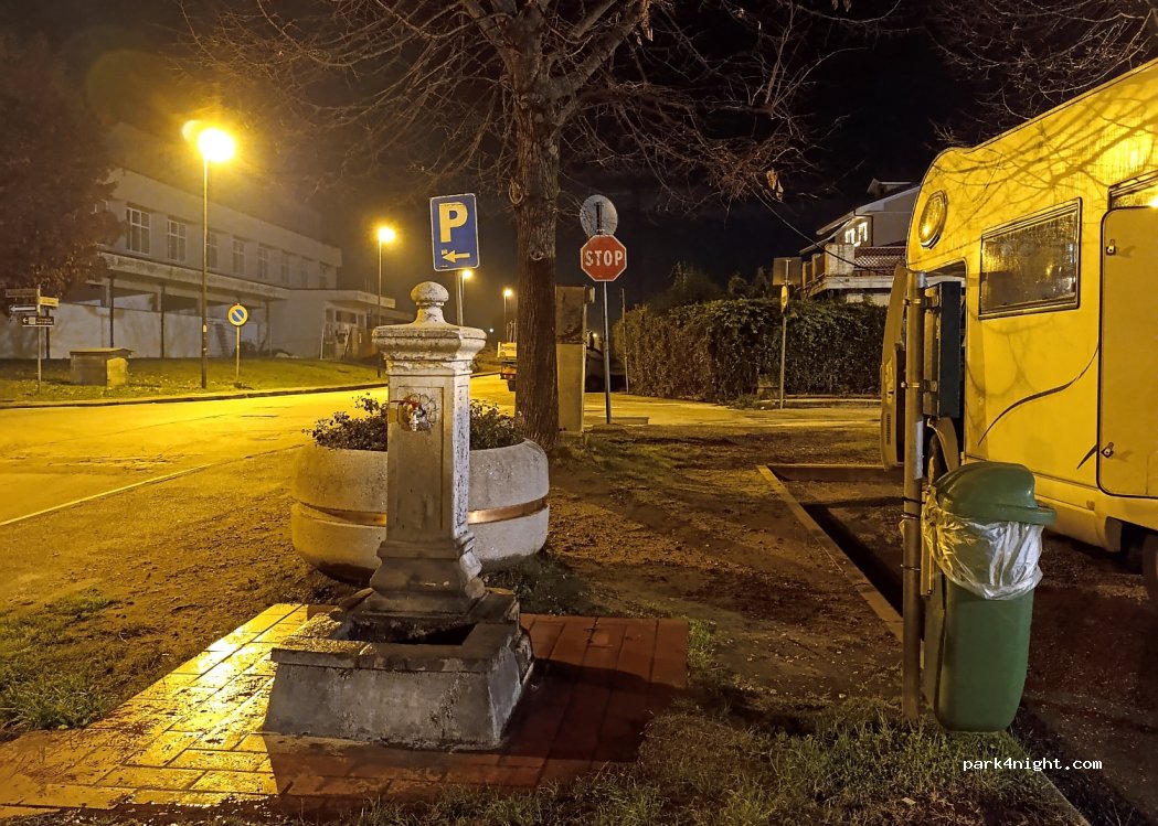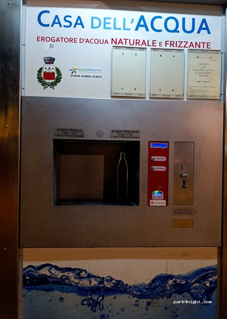 Hay una fuente gratuita donde hemos llenado 100 litros con nuestra manguera. La presión no es muy fuerte, pero más que suficiente. Al lado hay una fuente para llenar botellas de agua normal y con gas. El párking es amplio y no hay señal de que estén prohibidas las autocaravanas. Tiene pinta de ser tranquilo y seguro incluso para pernoctar.