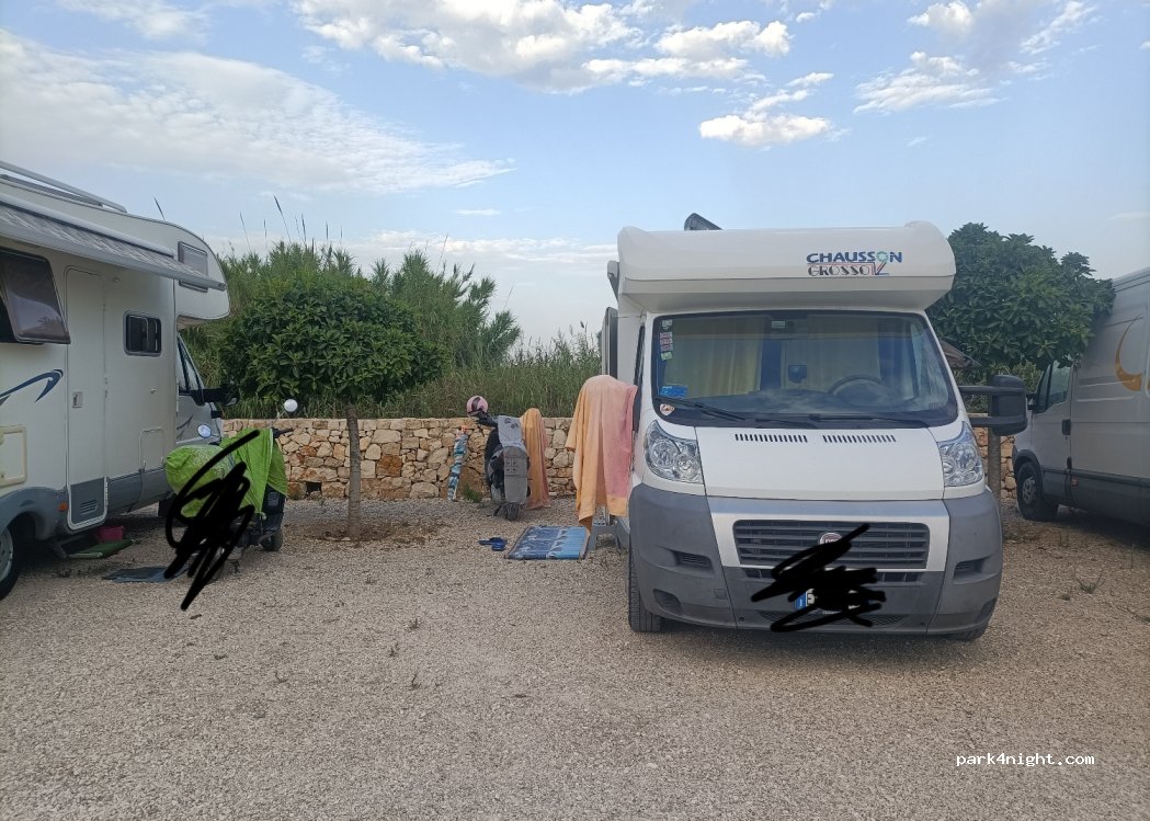 Siamo qui da qualche giorno : area destinata al parcheggio dei camper molto tranquilla ,su piccola ghiaietta , possibilità di allaccio corrente a consumo ,mare a 2 passi attraversando la strada ,paese a circa 500 MT ,docce e bagni a 50 centesimi .La proprietaria super gentile e disponibile .Costo 20 euro per 24 ore . Consigliatissimo