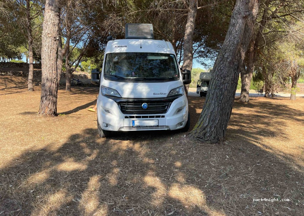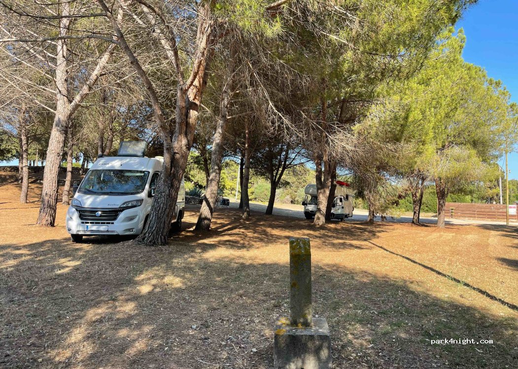 Dormimos aquí una noche con la camper, zona muy tranquila, no escuchamos ni un ruido, no hay señales de que esté prohibido pernoctar, está a medio camino entre la Gruta de Neptuno y Alghero. Nos despertamos con sombra por los árboles, y le pongo 4 estrellas porque hay muchísimas cigarras haciendo un concierto por la mañana. Hay cerca contenedores para tirar la basura.