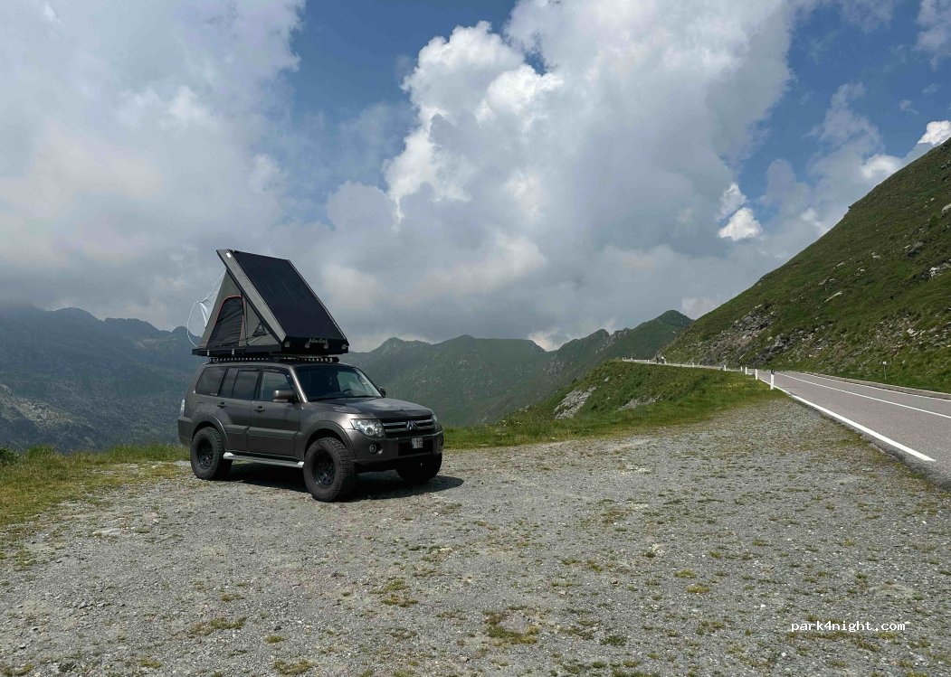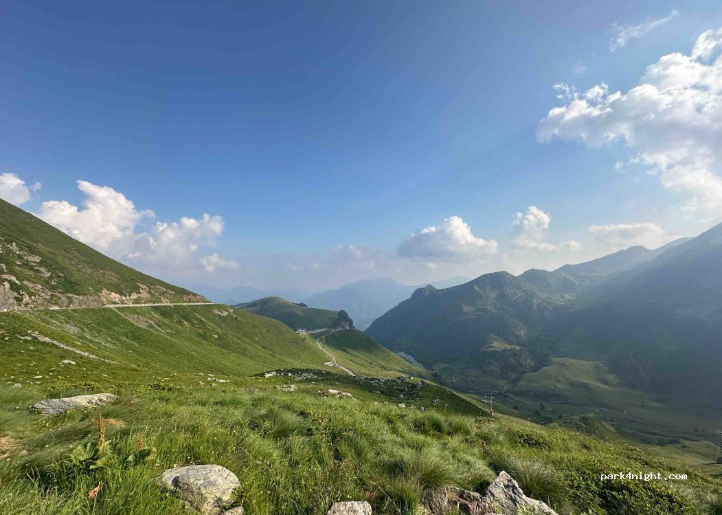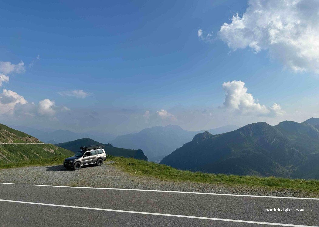 Ai margini di una strada con poco o nessun traffico notturno. Vista mozzafiato sulle montagne e sulla valle. Abbastanza piatto. Due o tre posti disponibili. Nessun segnale di divieto. La circolazione (soprattutto motociclistica) riprende intorno alle 8-9. Ideale per una notte. Strada sufficientemente larga per salire in CC, ma attenzione: la salita è ripida.
