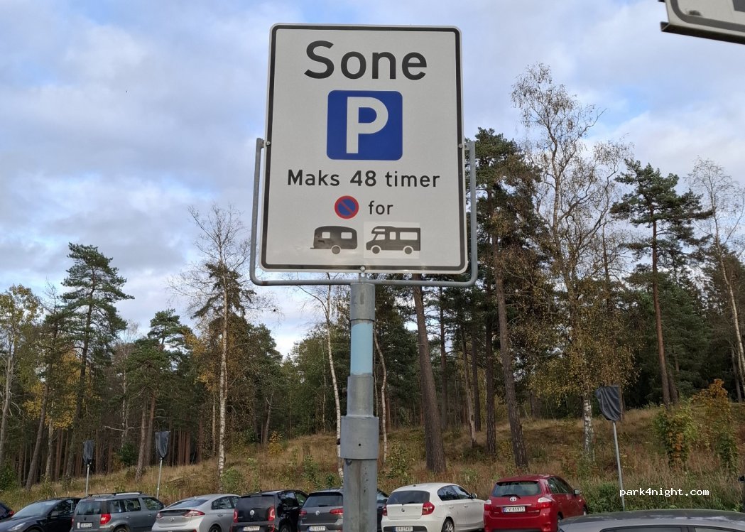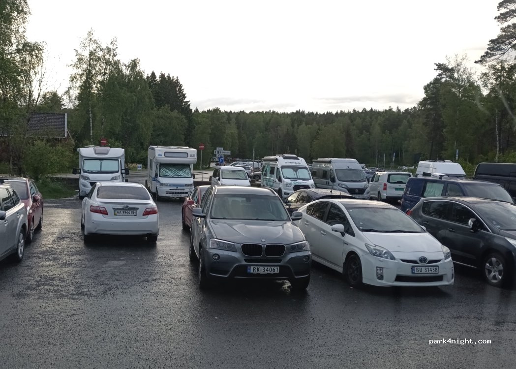 Huge parking, but campers allowed only in a small part, which gets full quite quickly. Great for Oslo visit, T-Bane line 5 starts right next to the parking lot. Beautiful swimming lake with short hiking options and firepits is just 1 minute away. Super popular with locals.