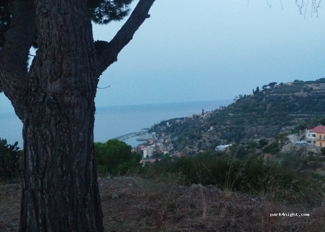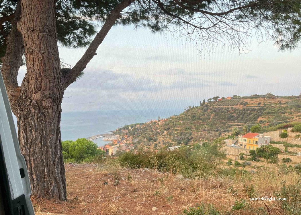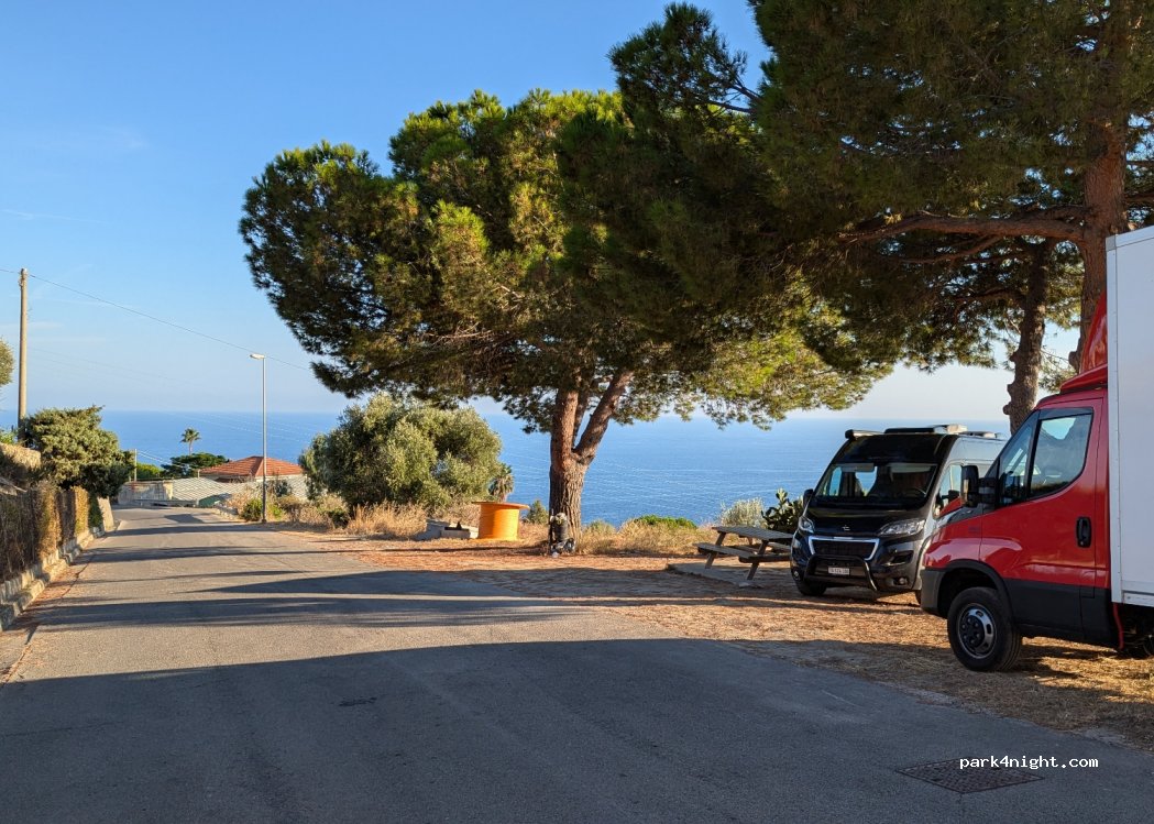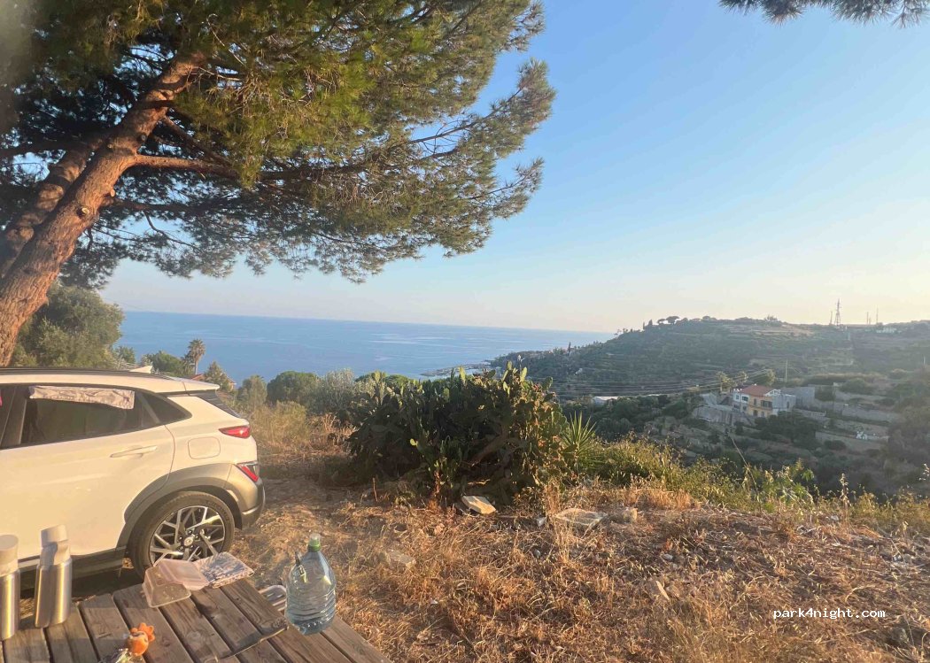 Coin en bord de route peu passante la nuit, avec une vue magnifique. Il y a une table de pique-nique. Accessible pour les vans, mais pas pour les gros véhicules. Quelques jeunes sont venus faire des "weeking" avec leurs scooters pendant une petite heure, puis sont repartis à la tombée de la nuit. Quelques guêpes et des rats dans les buissons à côté. Pratique pour une nuit entre Vintimille et San Remo.