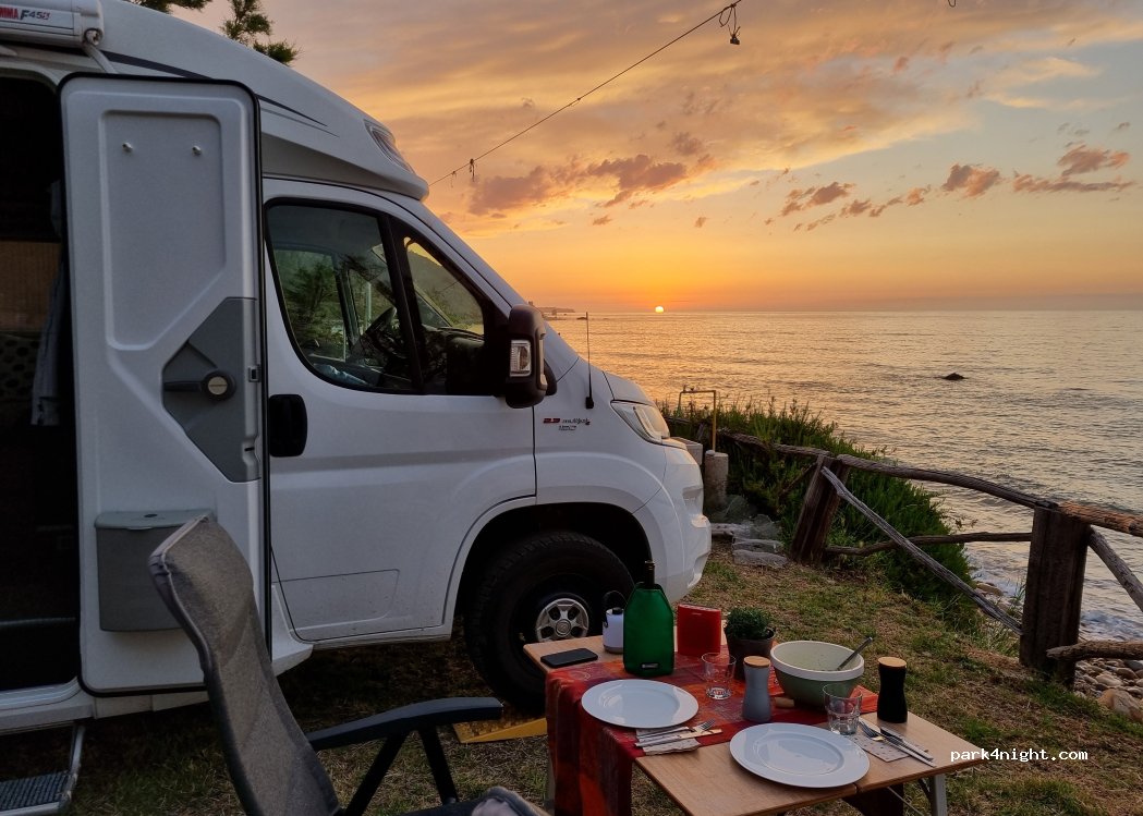 Vue sur les îles Éoliennes: un vrai régal pour les yeux ! Des sanitaires très propres et de l'eau chaude, un bon accueil, une eau cristalline (même assez bonne pour la baignade en cette fin avril...). Très accessible, même avec un 7 mètres. Ne soyez pas impressionnés par la pente de la rampe d'accès ; elle est très courte ! Un camping vraiment Top !