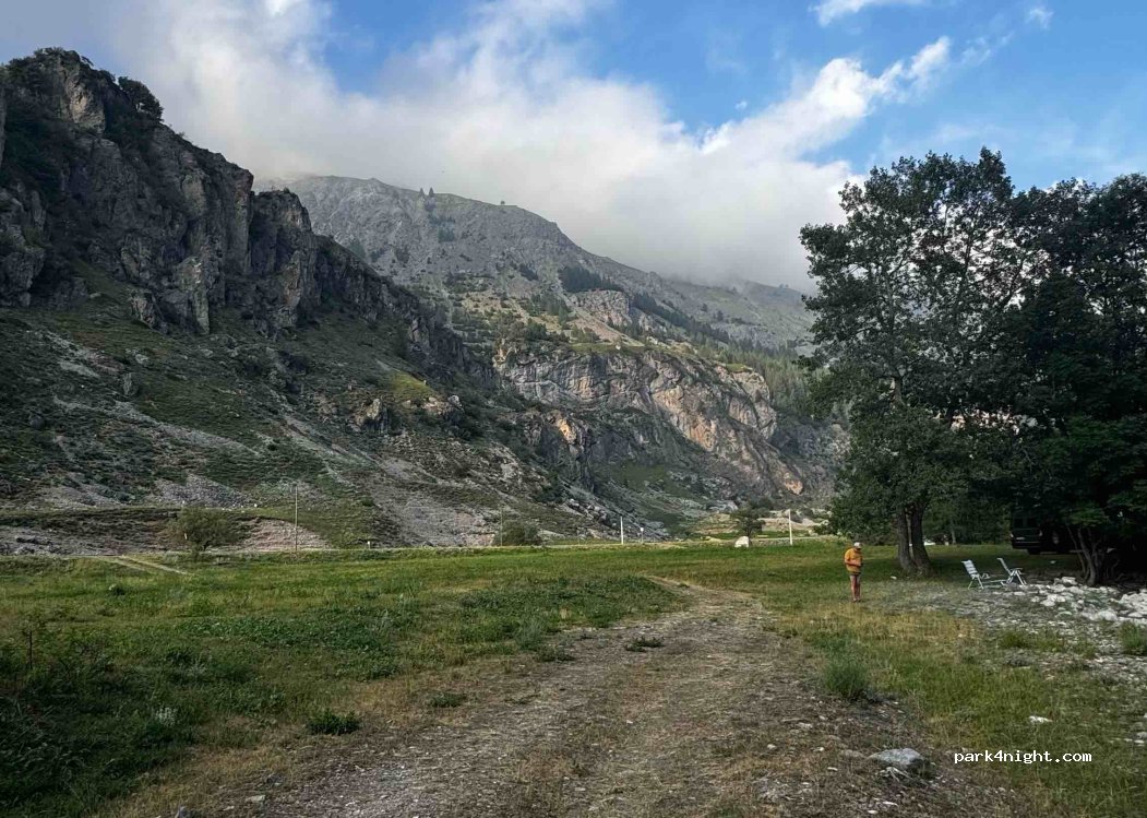 Fantastico parcheggio proprio accanto a un piccolo ruscello che puoi usare per rinfrescarti (nessuna possibilità di nuotare perché è troppo poco profondo). Dall'altro lato c'è una vista sulle montagne. Puoi camminare fino alla cascata e con un po' di fortuna vedrai le marmotte. La vicinanza alla strada non ci ha disturbato. Molto tranquillo di notte. Altrimenti puoi sentire di più il mormorio del flusso