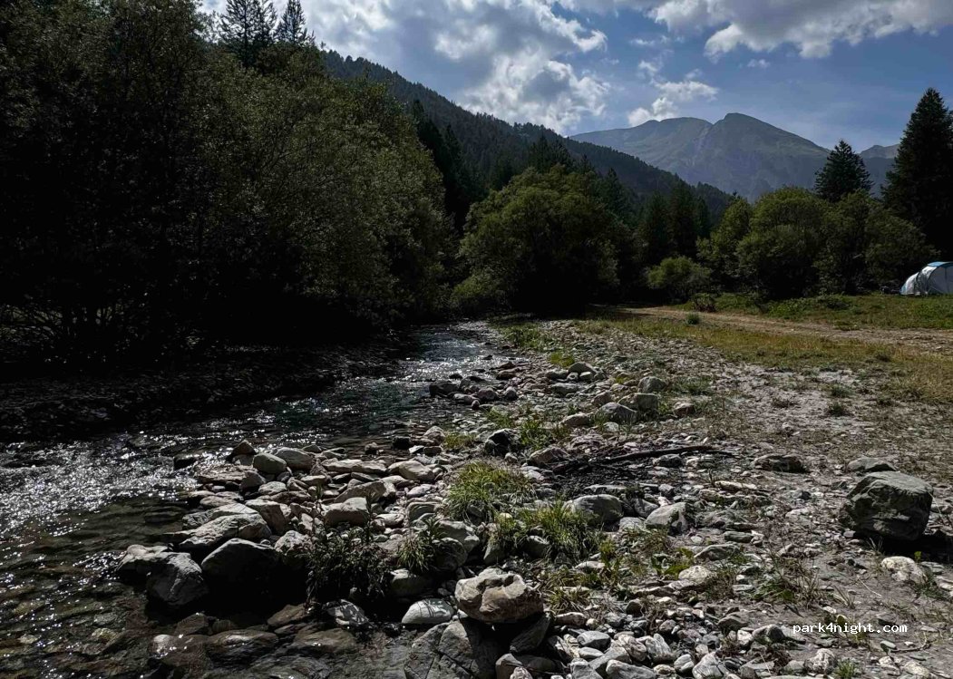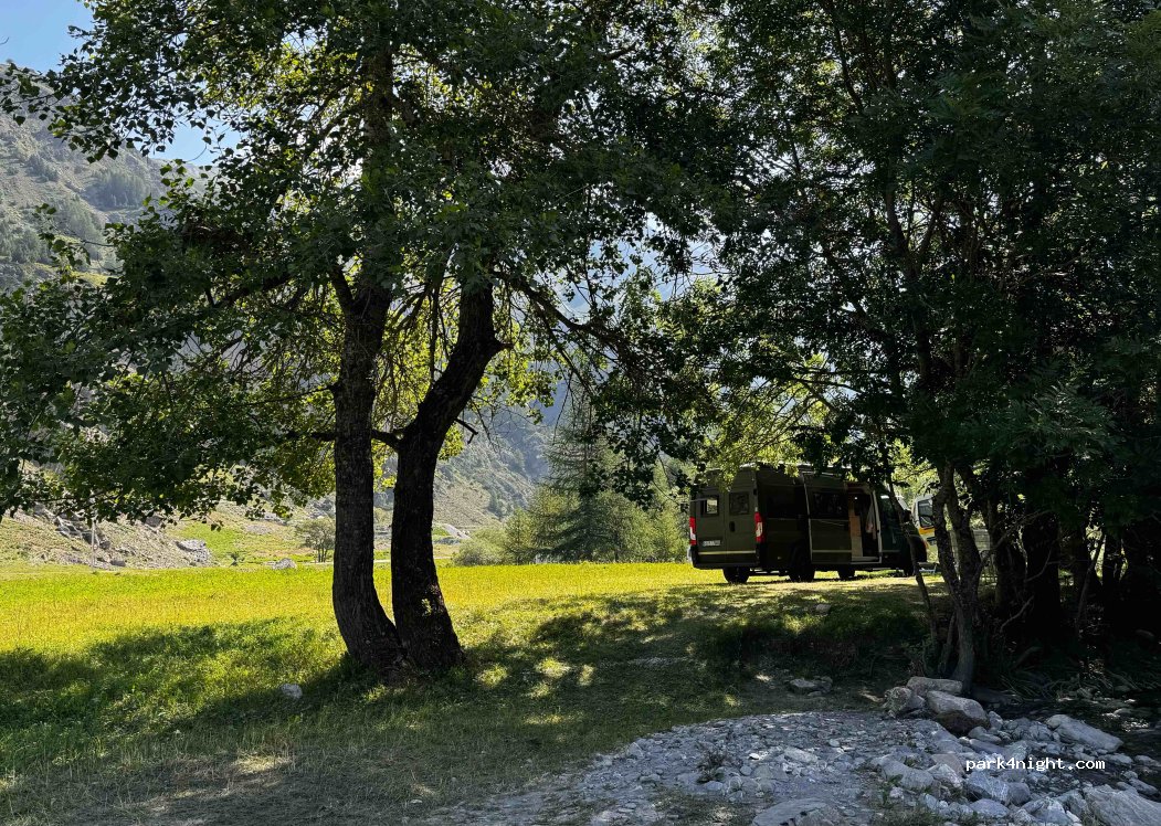 Fantastic parking spot right next to a small stream, which is great for cooling off (no swimming as it is too shallow). On the other side there is a view of the mountains. You can walk to the waterfall and with a bit of luck you will see marmots. The proximity to the road did not bother us. Very quiet at night. Otherwise you only hear the babbling of the stream