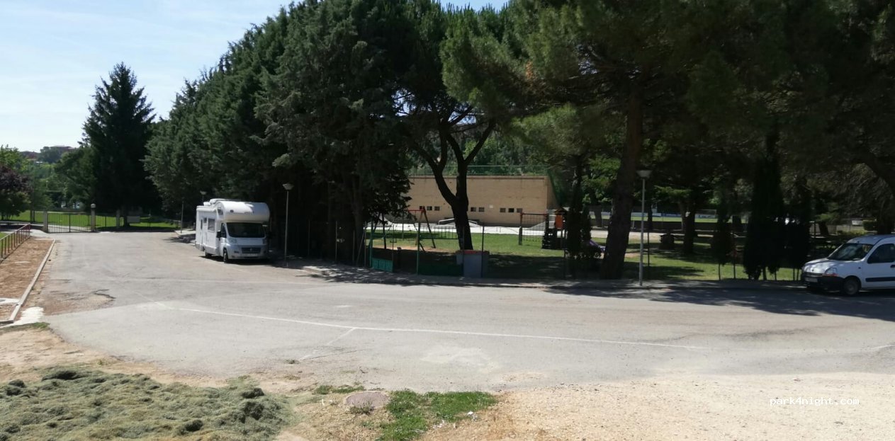 Paramos junto al parque, frente al campo de fútbol. Tranquilo por la noche aunque apagan las luces muy pronto y se queda la zona en penumbra. A unos minutos andando del pueblo. Aunque la carretera está cerca no se escucha por la noche ruido alguno