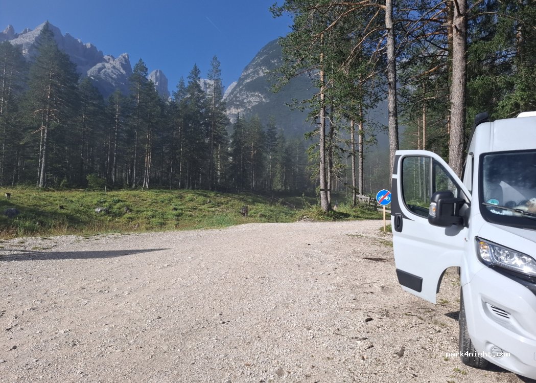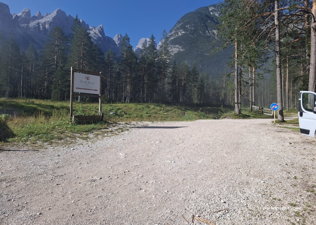 Öffentlicher Platz an der Einfahrt zum Hotel Croda Rossa. Platz für ein Fahrzeug. Nachts ruhig. Ausgangspunkt für Wanderungen. Toller Sonnenaufgang.