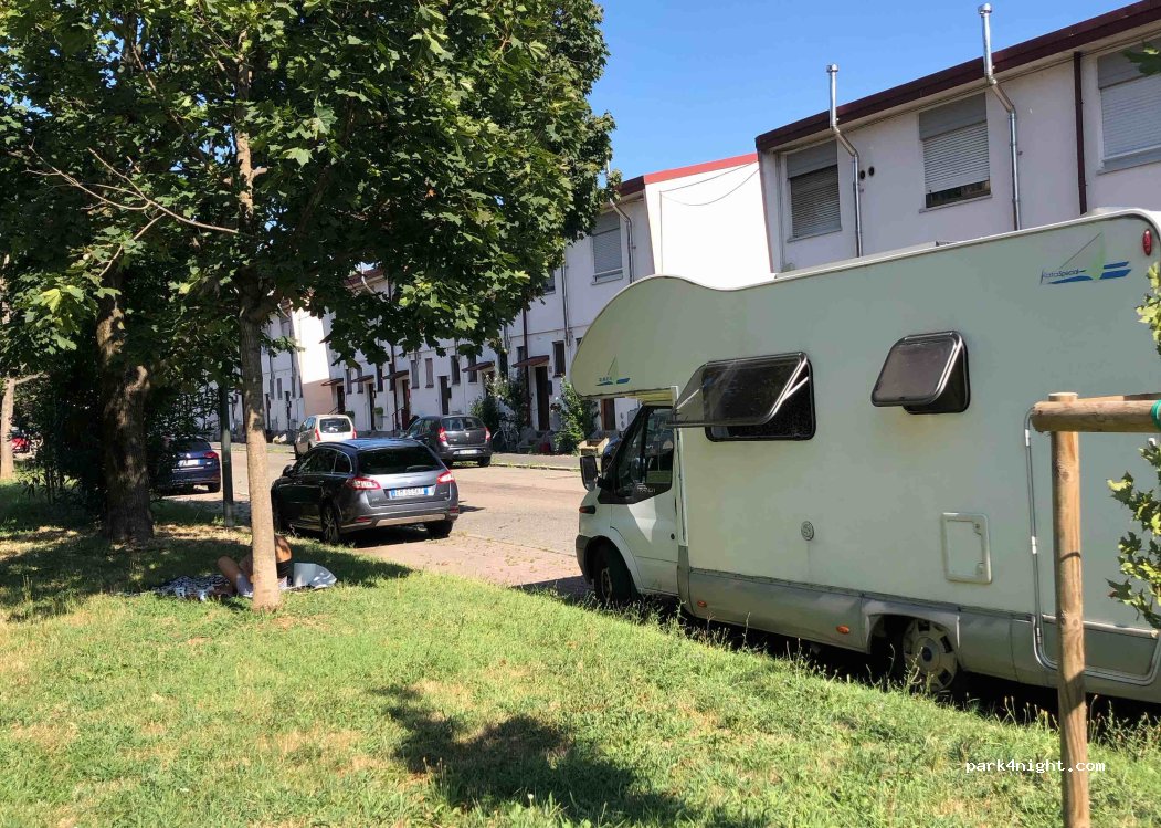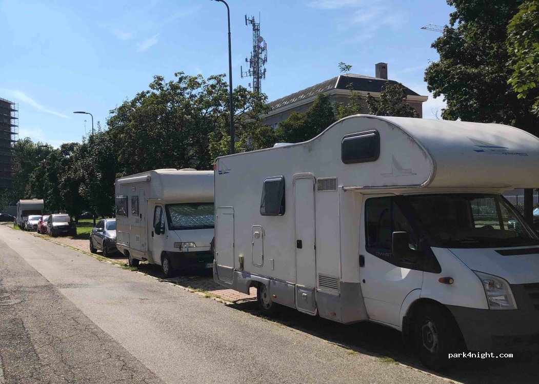 Aparcamiento de día y noche gratuito en las afueras de Milán, con zonas de sombra al lado de un prado. Varias autocaravanas pernoctando junto a nosotros entre semana en pleno agosto, no tuvimos ningún problema. Visitamos Milán en metro, dado que el parking está a 10 minutos de una parada de la M1, y un total de 25 minutos hasta el duomo. Lugar tranquilo y rodeado de casas, con el inconveniente de que pasan coches a cierta velocidad durante la mañana. En comparación a otros puntos, este nos dio seguridad.