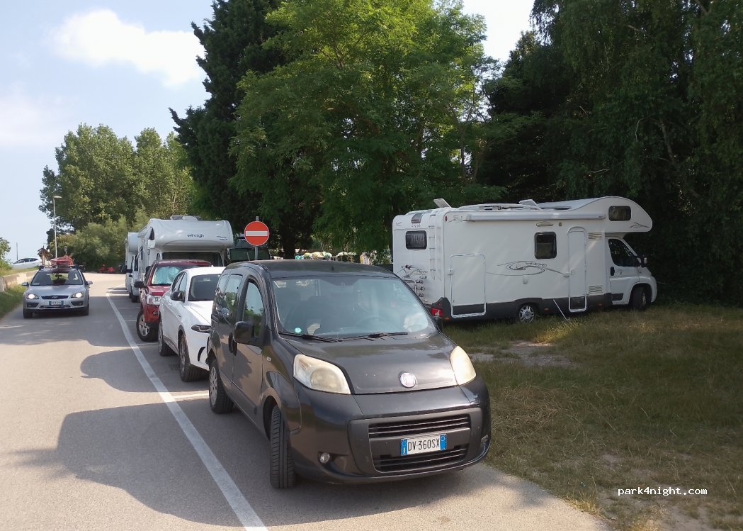 Perfect for a overnight and a visit to Caorle. Nice view in the morning over the laguna, fishing boats and you can hear the seawaves all the night. Very quiet. Free of charge in offseason, we went there on 29.09.2022. Nice walk to their beach, starting 50m away. Around 3-6 available places. Our motorhome is 7.5m and we parked 2 similar ones over here.