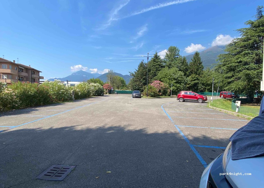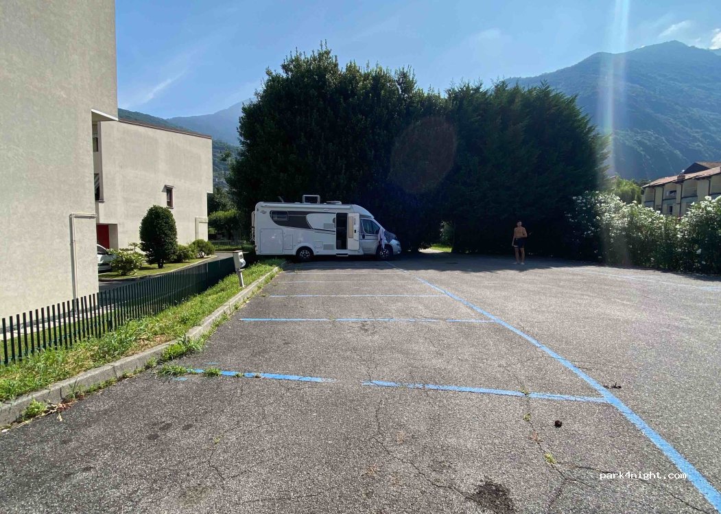Parking calme à 300 m du lac (dont douche et toilettes publiques) dans un quartier résidentiel. L'électricité est disponible à côté des toilettes et il y a une borne de recharge gratuite pour vélos électriques. Il y a un marché hebdomadaire ici le mardi pendant la journée et le parking n'est pas utilisable.
