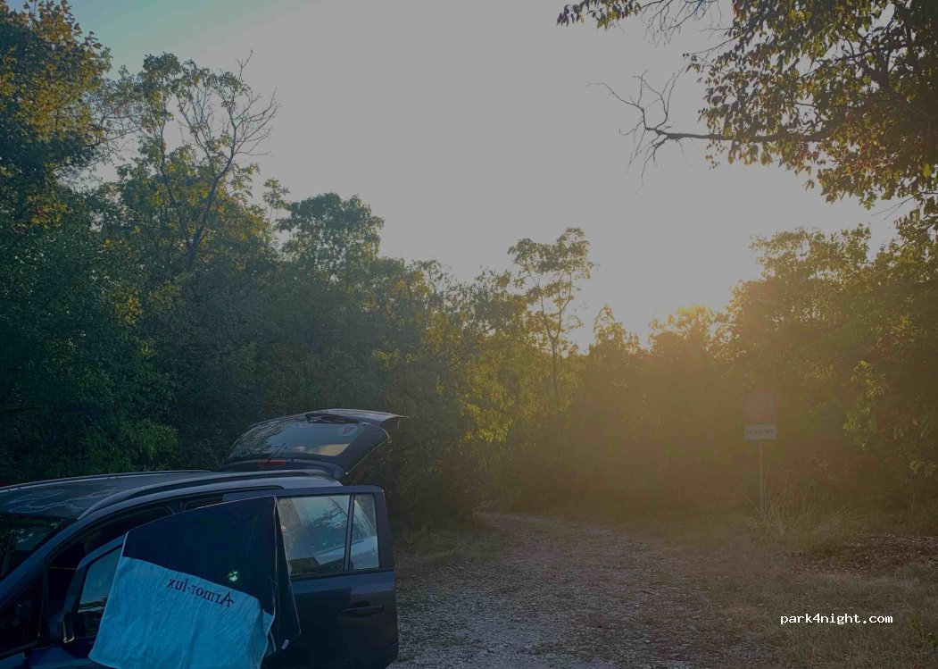 Accotement gravier sur une route à sens unique. Très peu de passage. Il y a la place pour 2 vans ou 1 camping car. Réseau ok. Lieu parfait pour 1 ou 2 nuit au calme.
