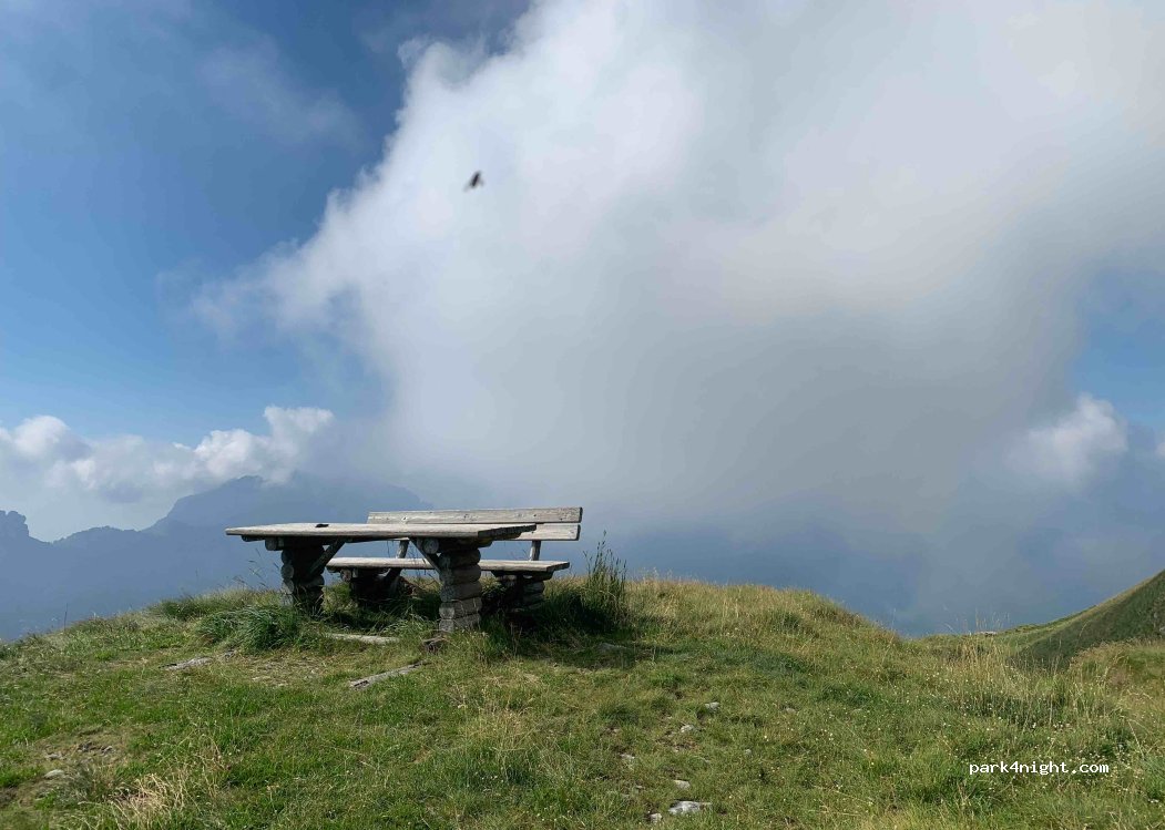 Aire de pique-nique à côté de la route avec une belle vue sur les montagnes et l'hôtel Bonardi. Il y a 2 tables de pique-nique et beaucoup d'espace pour se garer. De plus, si vous avez une voiture, il est possible de descendre un chemin de gravier plus proche des tables de pique-nique et d'être plus isolé de la route. J'ai passé une nuit ici et j'ai été réveillé par une belle vue. Calme la nuit, le matin un peu de circulation de motos et de voitures. Attention au vent le soir car cet endroit est assez haut dans les montagnes.