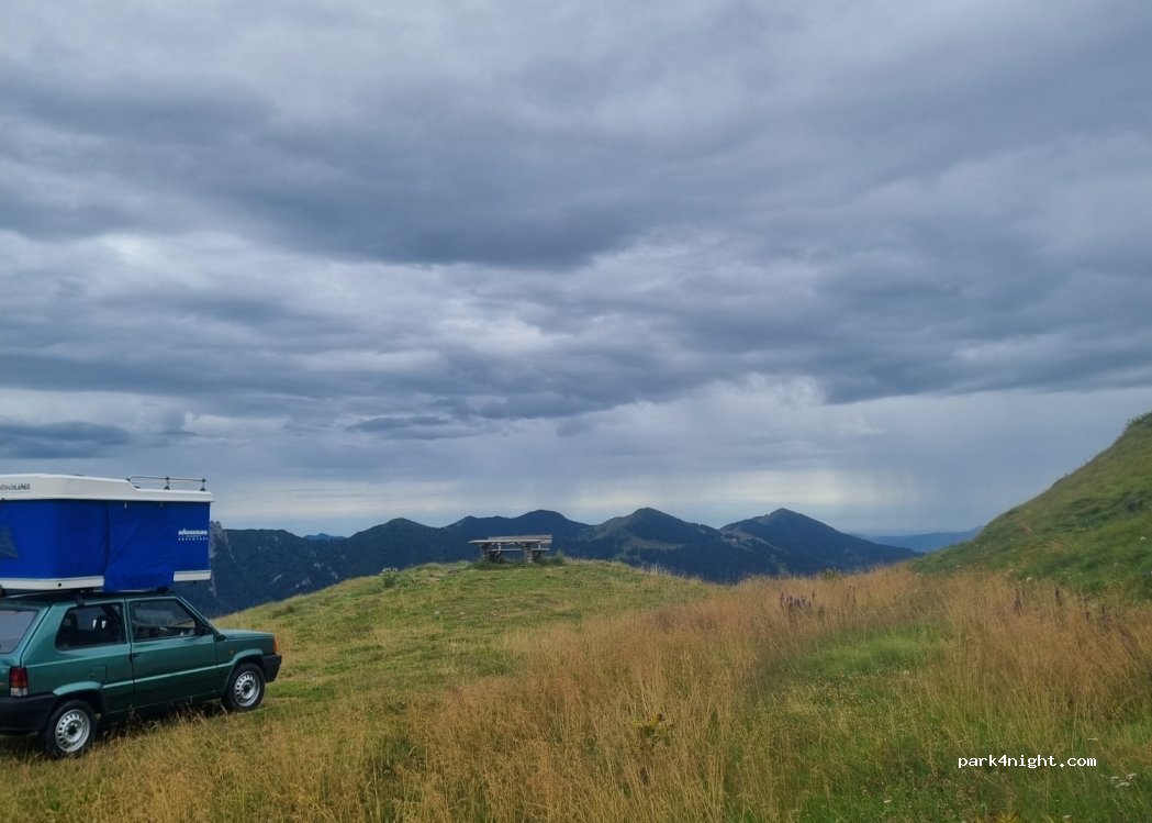 Picknickplatz neben der Straße mit herrlicher Aussicht auf die Berge und das Hotel Bonardi. Es gibt 2 Picknicktische und viel Platz zum Parken. Auch mit dem Auto kann man über eine Schotterstraße näher an die Picknicktische fahren und ist so von der Straße abgeschirmter. Habe hier eine Nacht verbracht und wurde mit einer wunderschönen Aussicht geweckt. Nachts ruhig, morgens ein wenig Verkehr durch Motorräder und Autos. Passen Sie abends auf den Wind auf, da dieser Ort ziemlich hoch in den Bergen liegt.
