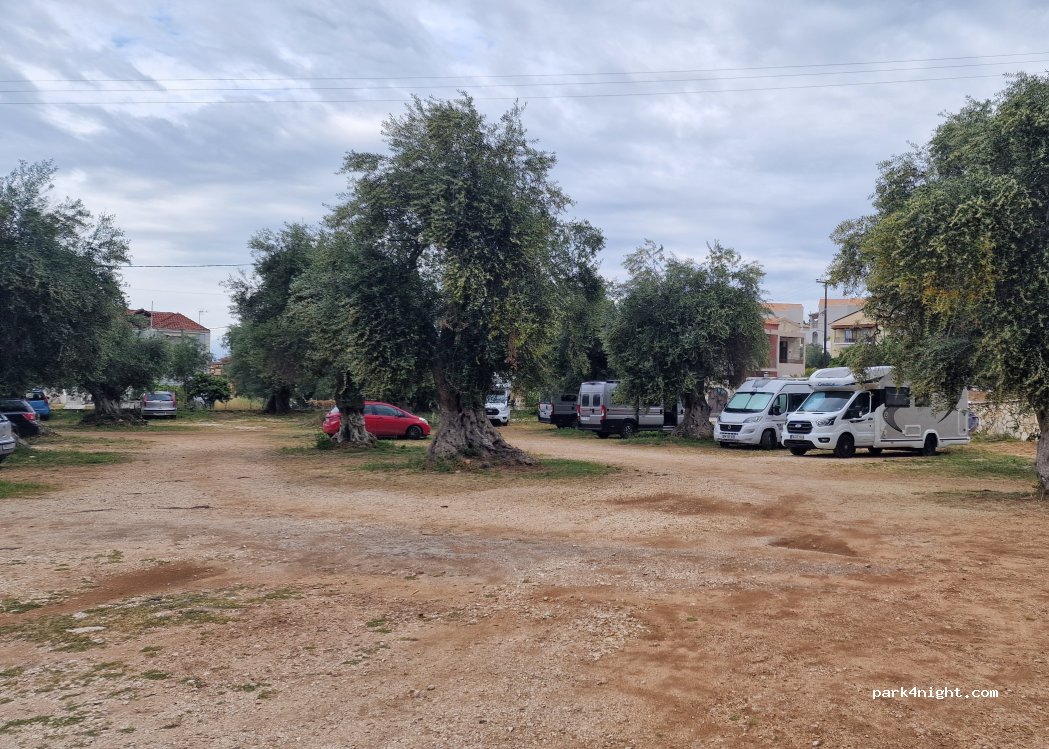 Stayed three nights 29/9 - 2/10. Free as no guardian. Other campers also stayed for free. Lots of space with shade from olive trees. 1 minute walk from lovely marina. Some traffic noise at night but otherwise quiet, peaceful and safe. Car park used by locals but they didn’t bother us or seem to mind we were there. Good bakery across the road with water point nearby. Some mosquitos at night.