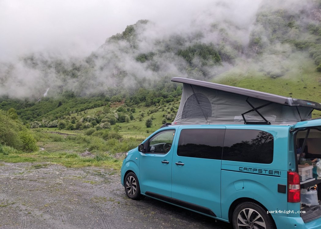 Plenty of parking for vans of all sizes. Auberge here and also walks upto lakes. Free and plenty of space on 21 June. May get busy in high season. We didn't stay the night