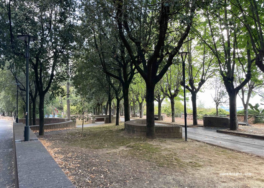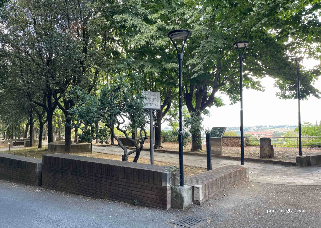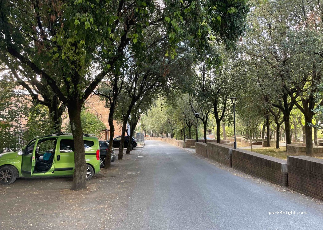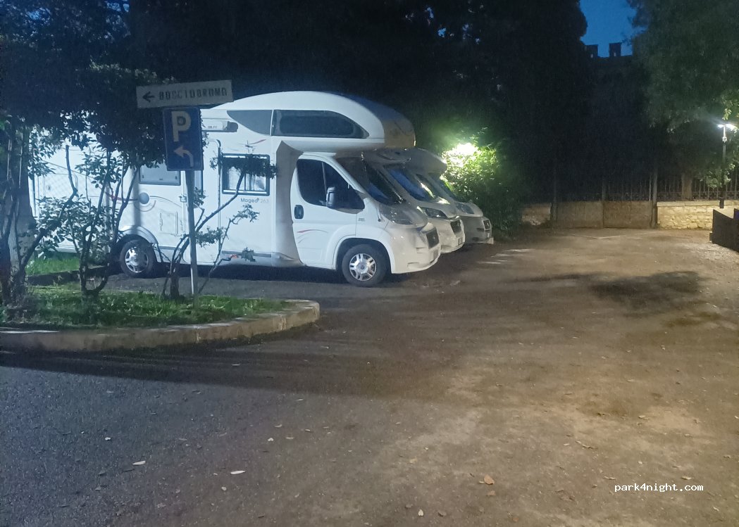 Public garden below Narni, very shaded in the afternoon, airy, quiet. Games for children, dog area, fountain, garbage bins, with a view of the valley. I was looking for a place to eat and this is excellent rather than the parking lot for the historic center. I travel in a camper. I do not see any prohibitions for campers, there are public offices adjacent.