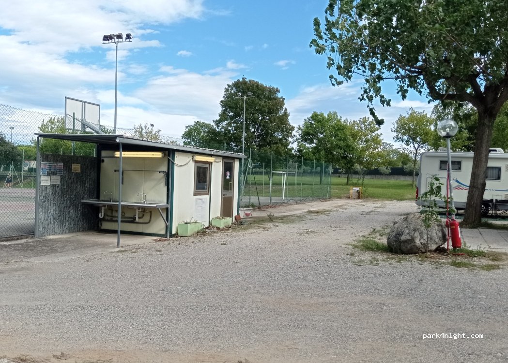 Perfecto pasar la noche. Tienen una zona para campers autocaravanas con electricidad y una zona común donde hay una pica para poder limpiar platos o lavar ropa por ejemplo! Teniamos acceso a las duchas con agua caliente y secador de pelo. Pagamos 12€ por noche + 6 por persona. Quedamos encantados! (Desconocemos si hay servicio de vaciado y llenado de aguas.