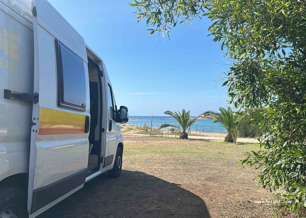 Camping affacciato sul mare: piazzole camper su terra, non ombreggiate. Camper service e corrente inclusi nella tariffa, ma a basso voltaggio. Bagni e docce non troppo puliti: docce calde “incluse” perché si ha un accumulo di acqua riscaldata dal sole, ma non potabile, se non da alcune fontanelle sparse nel campeggio. Presenza di bar e ristobar all’interno.