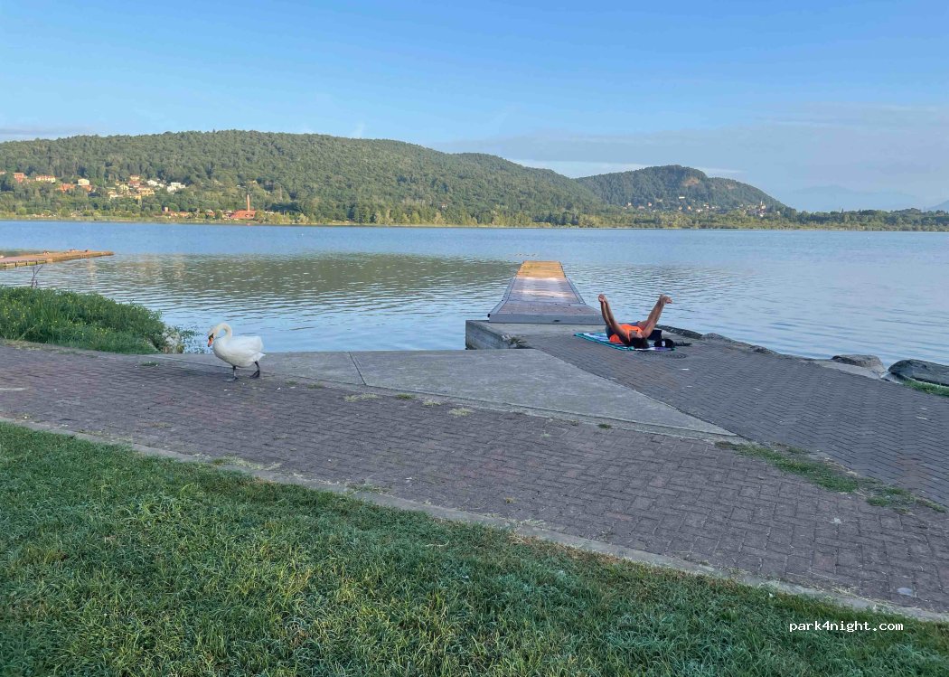 SPEZIAL-VAN. Kleiner, abgeschiedener, ruhiger, fast ebener Parkplatz mit Blick auf den See. Einige Wanderer und Mountainbiker auf der Durchreise. 2 Außenduschen und 2 Wasserhähne (Kaltwasser), 2 Toiletten und Waschbecken (behindertengerecht), ein Café-Restaurant vor Ort. Ein wenig Lärm vom wenige Kilometer entfernten Mailänder Flughafen und vorbeifliegenden Flugzeugen von 7 bis 23 Uhr, aber erträglich. 5,50 m MAXI CAMPER zum Parken!!