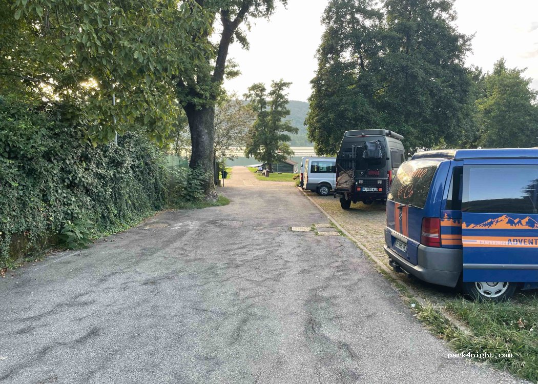 Rue étroite pour accéder au parking. Accès direct au bord du lac avec un parc de jeux pour enfants. Toilettes + lavabo gratuits et deux douches d'eau froides sont disponibles aussi. Nuit très calme, pas de circulation. Pas de gêne via le club d'aviron.