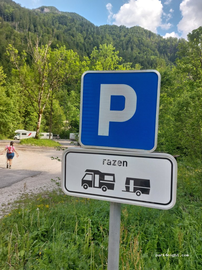 Na wjeździe widoczny znak w j. słoweńskim zakazujący parkowania kamperów i przyczep kampingowych. Jednak większość patrzy na rysunek i myśli, że to właśnie miejsce specjalne pod kemping. Cicha i spokojna noc w busie. Blisko rzeka Savica i wlot do Doliny Logarskiej. Brak jakiegokolwiek zaplecza, jedynie 2 stoły z ławkami w tym jeden lekko zarośnięty krzakami.