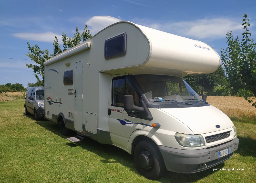 Private parking where you can park day and night. The land is about 3 km from the sea and about 1 km from the Santa Monica racetrack. The area is very quiet. The center of Misano Adriatico is about 3 km away where you can find supermarkets and various shops. The city of Riccione is about 6 km away. Cattolica is about 5 km away. It is perfect if you have bicycles: there is a cycle path that reaches the sea. It is also perfect for those who prefer to visit the hills of the Romagna hinterland. The land is flat and shaded, as you can see from the photos. The price refers to the camper parking per day.