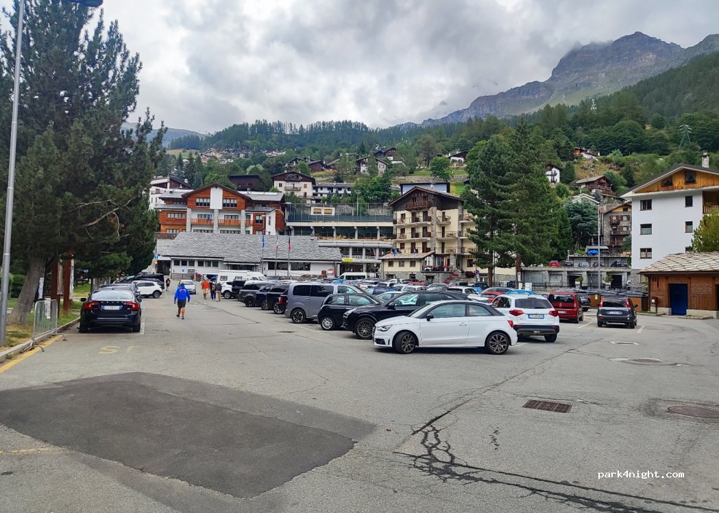 Parking pour voitures (jusqu'à 5,50 m de long) dans une excellente position soit pour le centre de Valtournenche, soit pour de beaux sentiers. Aucune interdiction pour les campeurs.