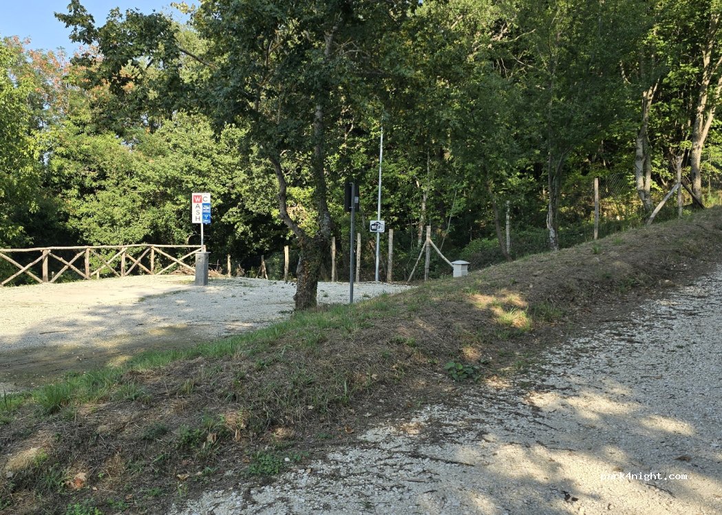 Confermo tutto dal commento precedente, carico e scarico funzionanti e perfino rubinetti presso le piazzole, però niente elettricità. Appena fuori dal cancello, rientrando dal paese in pieno giorno ho incontrato un cinghiale con atteggiamento minaccioso, mi ha soffiato e scalpitato, per fortuna se ne è andato vedendo che io arretravo con calma.