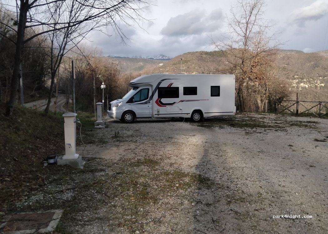 Area camper nuova con tutti i servizi per l'ingresso chiedere in paese ,passato una notte tranquillissima il paese è carino sicuramente ha passato tempi migliori, in paese è presente un bar pizzeria chiuso il mercoledì,vista sul Gran Sasso bellissima