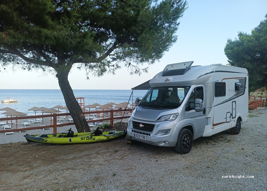Arrived today and Wow this is a fantastic spot . motorhome spaces overlooking the beach ,beds and brolly shades included in 24 Euros per night inc electric and water . bar , restaurant on site great spot for a relaxing break . showers and toilets but basic Italian but overall cannot fault the facilities and position. you won't be disappointed with this site .