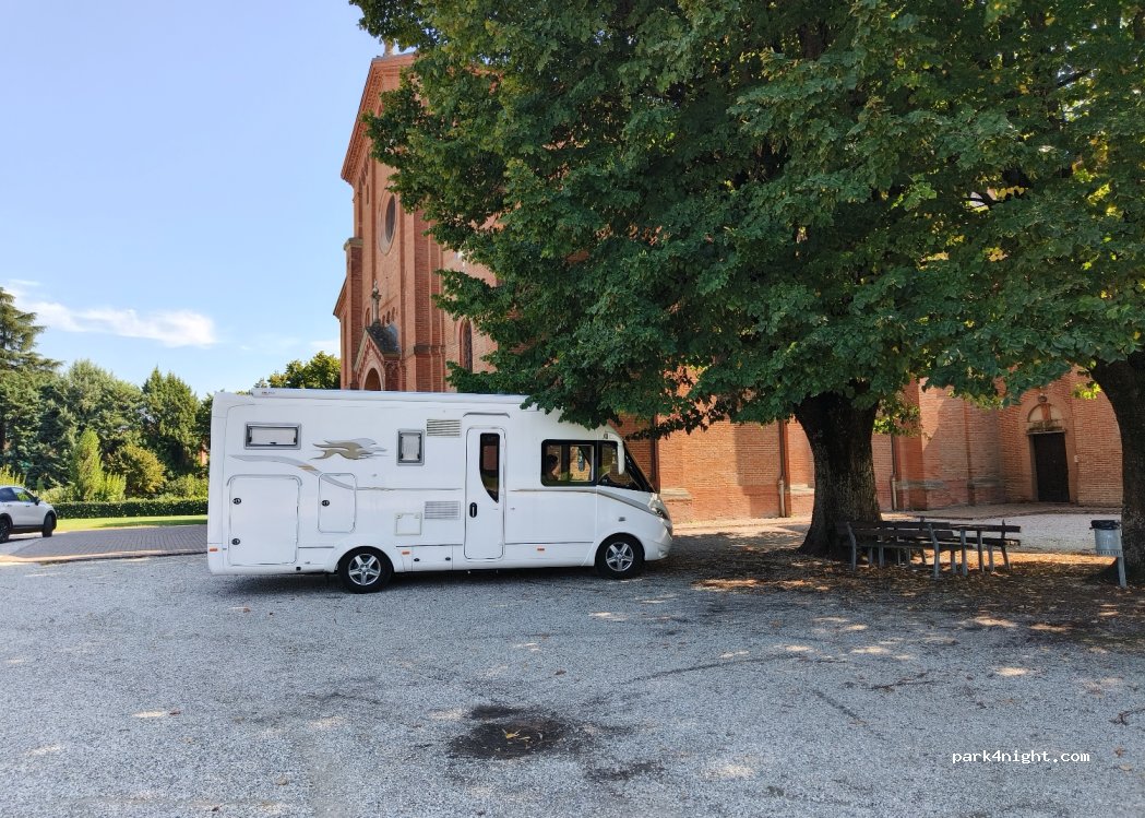En direction de San Marino nous avons décidé de sortir de l’autoroute pour faire notre pause de midi à cet endroit, nous avons été accueilli par un merveilleux son de cloche. Grand parking.