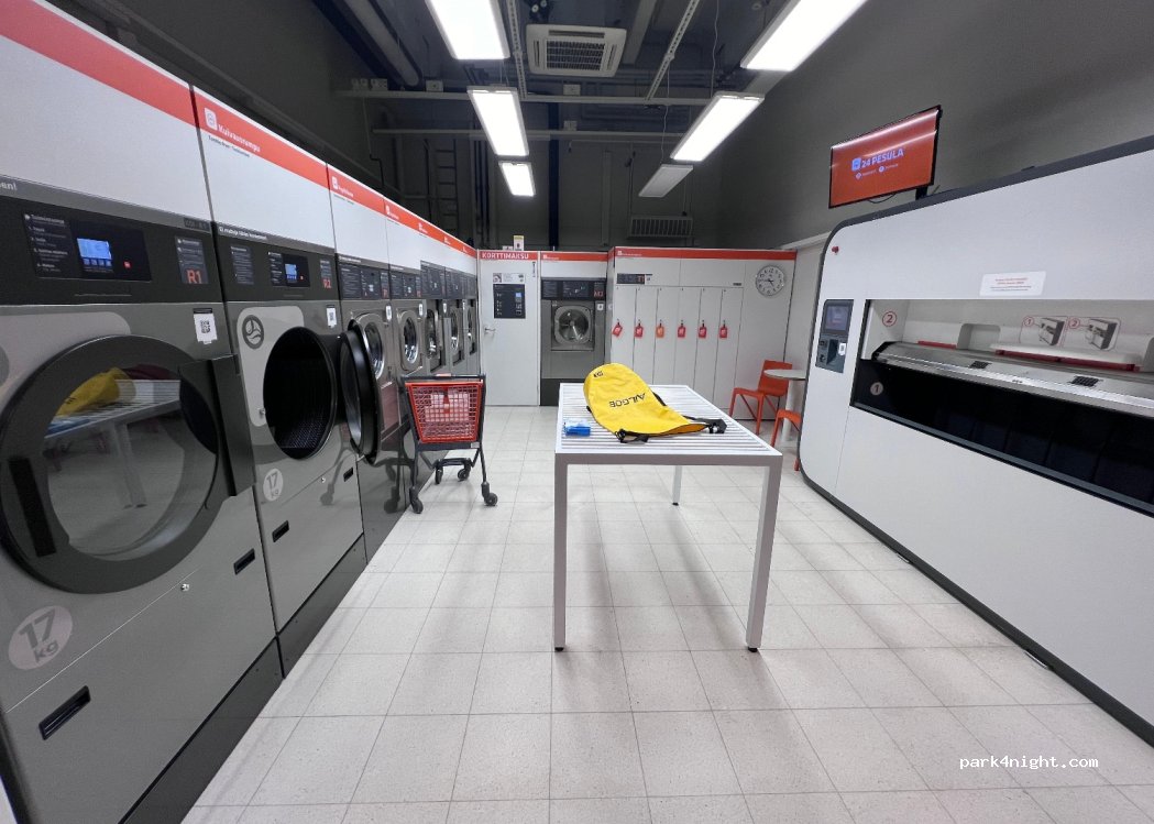Waschsalon inkl. Trockner mit Selbstbedienung. In einem Supermarkt (24/7 geöffnet) mit Friseur, Apotheke, Sushi Imbiss, Alko Laden und Toiletten. Der Waschsalon befindet sich im hinteren Teil neben dem Sushi Imbiss.