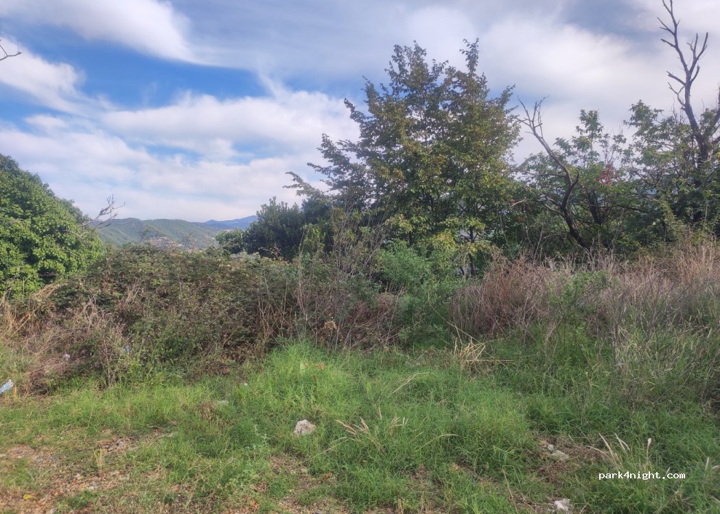 Area di sosta lungo la strada, spazio per un camper. Bella vista dietro gli alberi.
