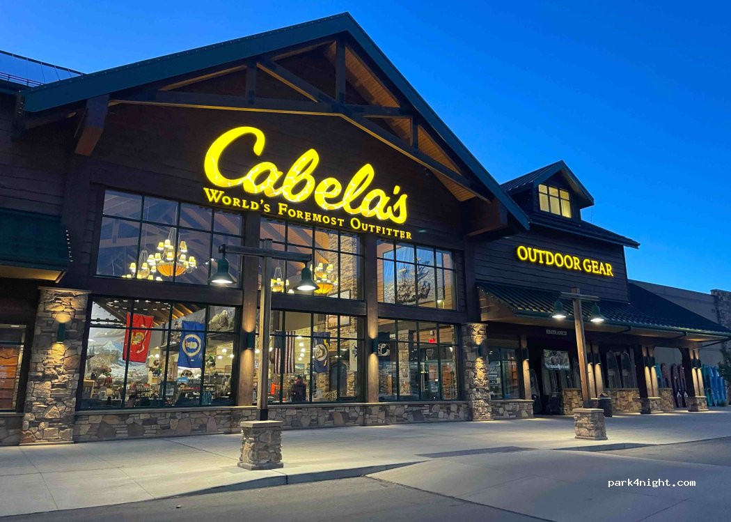 Parking du magasin Cabela’s autorisant les RV à stationner nuit comprise. Nous avons tout de même demandé confirmation à un employé du magasin qui nous a remercié de demander et nous a confirmé que c’était prévu pour. Situé dans une zone commerciale, proche accès autoroute. Multiples restaurants autour.