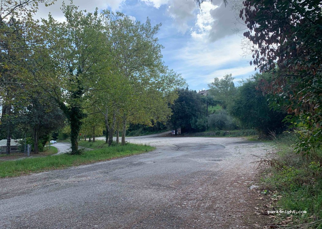 Large parking lot, partly gravel, partly asphalt - slightly sloping. We had lunch here. Didn't see any prohibition signs. No services of any kind, no trash cans. Located next to the road towards Todi, which is about 25 minutes away on foot.