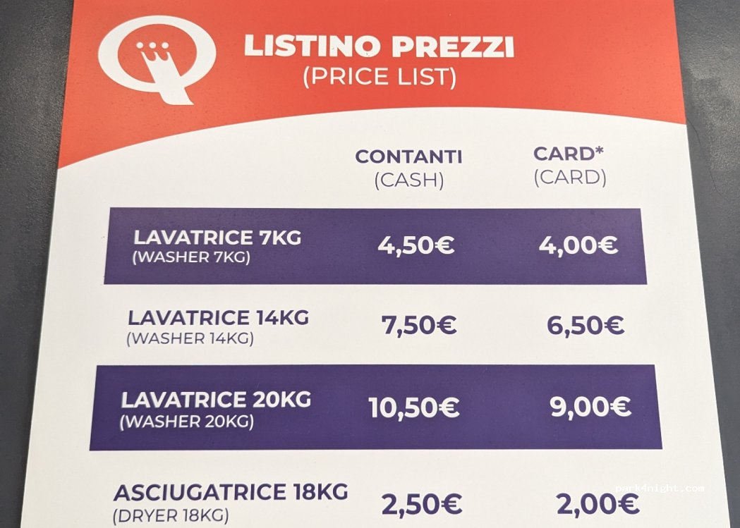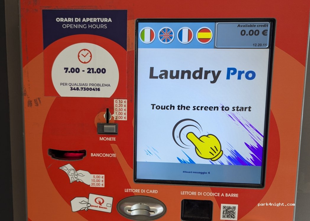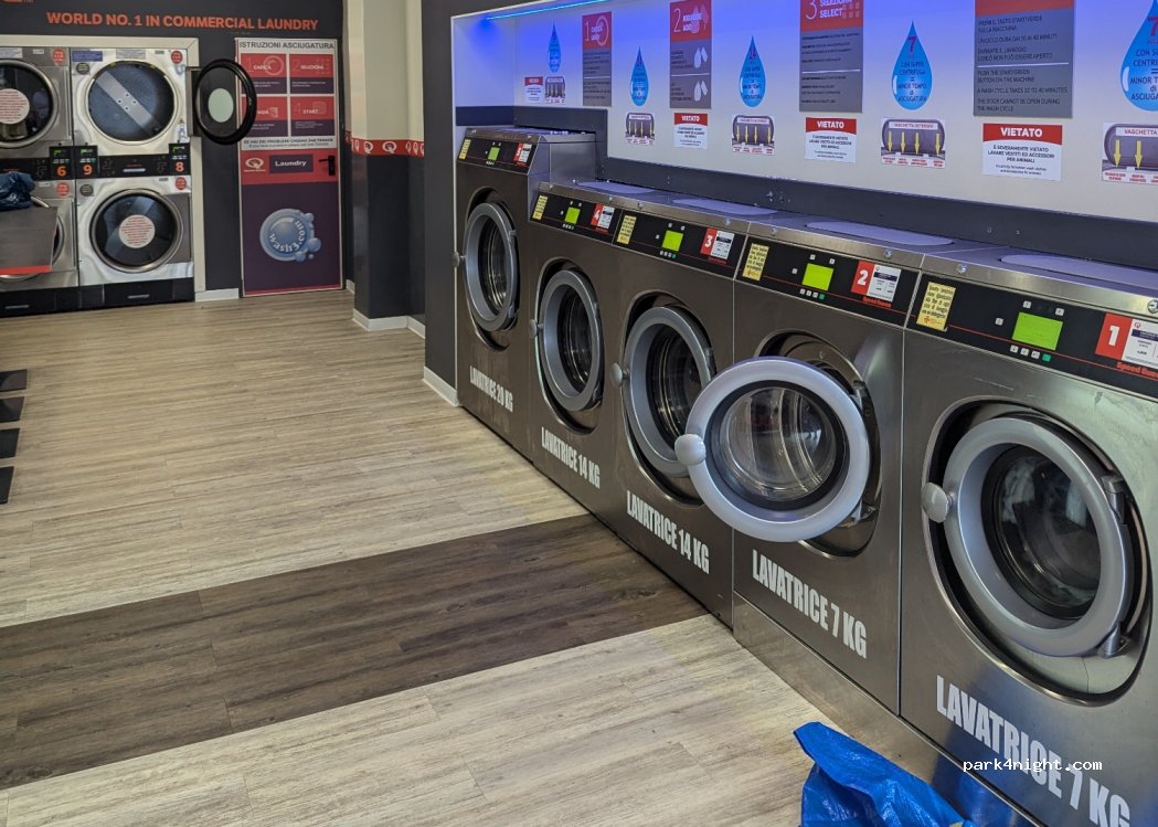 Lavanderia self-service (Speed Queen). Aperta dalle 7:00 alle 21:00. Puoi usare il tuo detersivo o usare la lavatrice. Molto pulita. Solo contanti. Lunghi parcheggi sulla strada per grandi camper. Probabilmente è difficile parcheggiare in alta stagione.