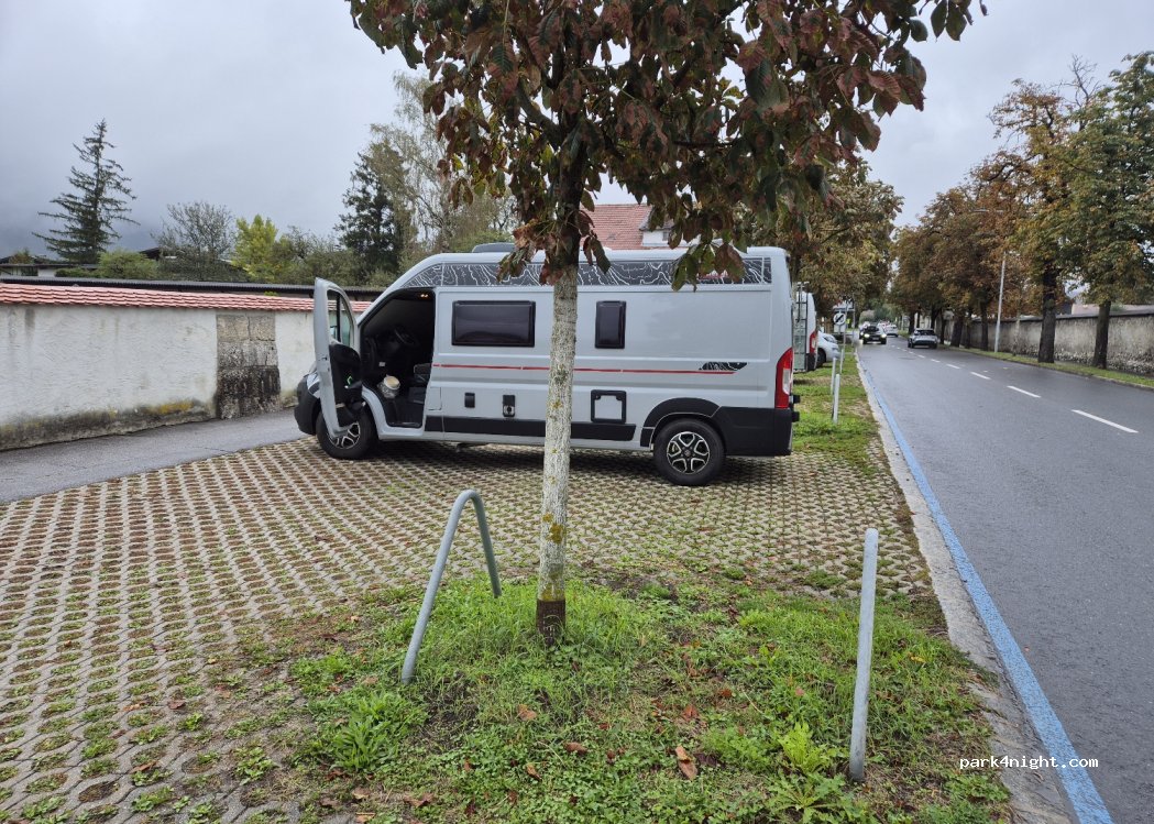 Parking for campers and cars max 7 meters. On a slope. Ok for one night. Not very noisy even if on a road with little traffic. Quiet night 15min walk from the center of Hall