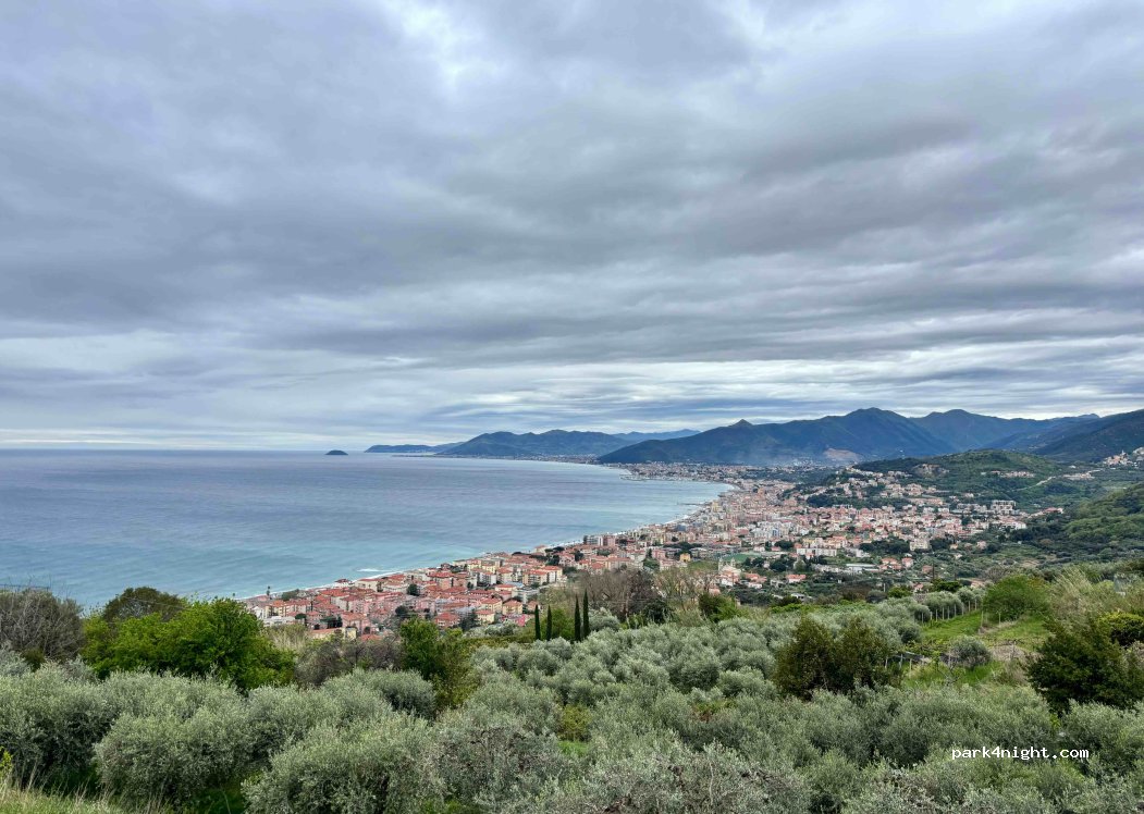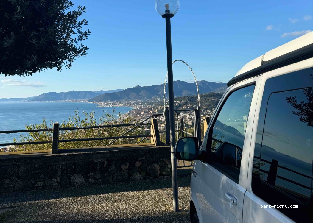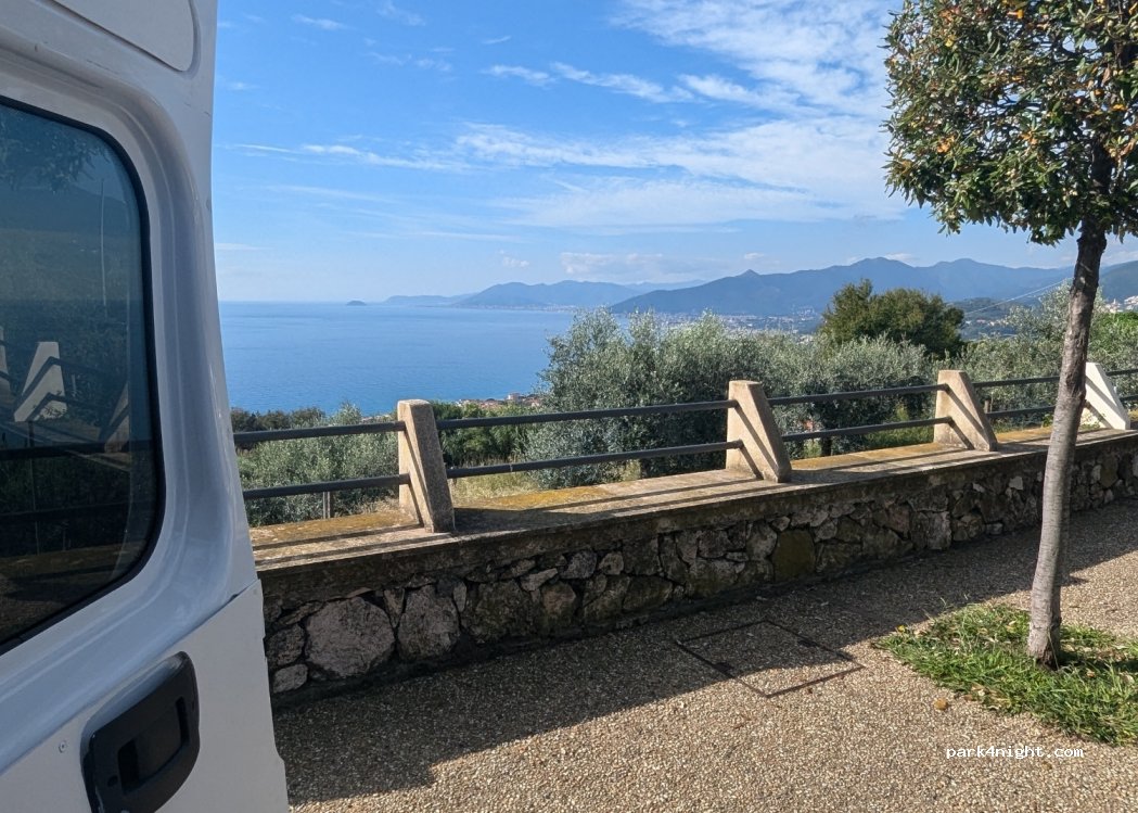 Beautiful view from lower car park for Borgio Verezzi. Paid car park during the day, free overnight. Very quiet.