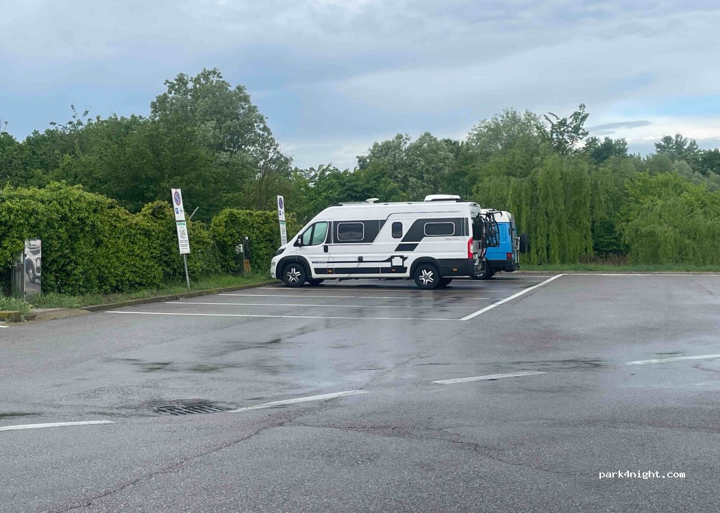 Parada perfecta de camino a Modena. Pasamos una noche, una ducha caliente gratis y dormimos en la zona de autocaravanas rodeados de camiones. Algo ruidoso a por la mañana con la salida de los camiones, un sitio ideal.