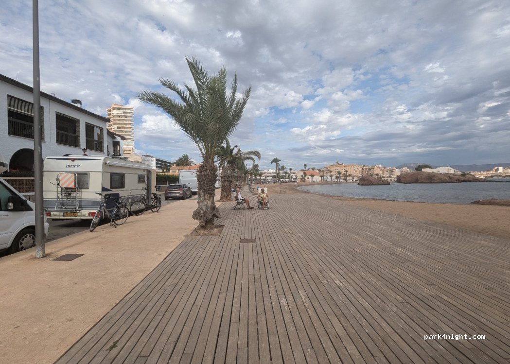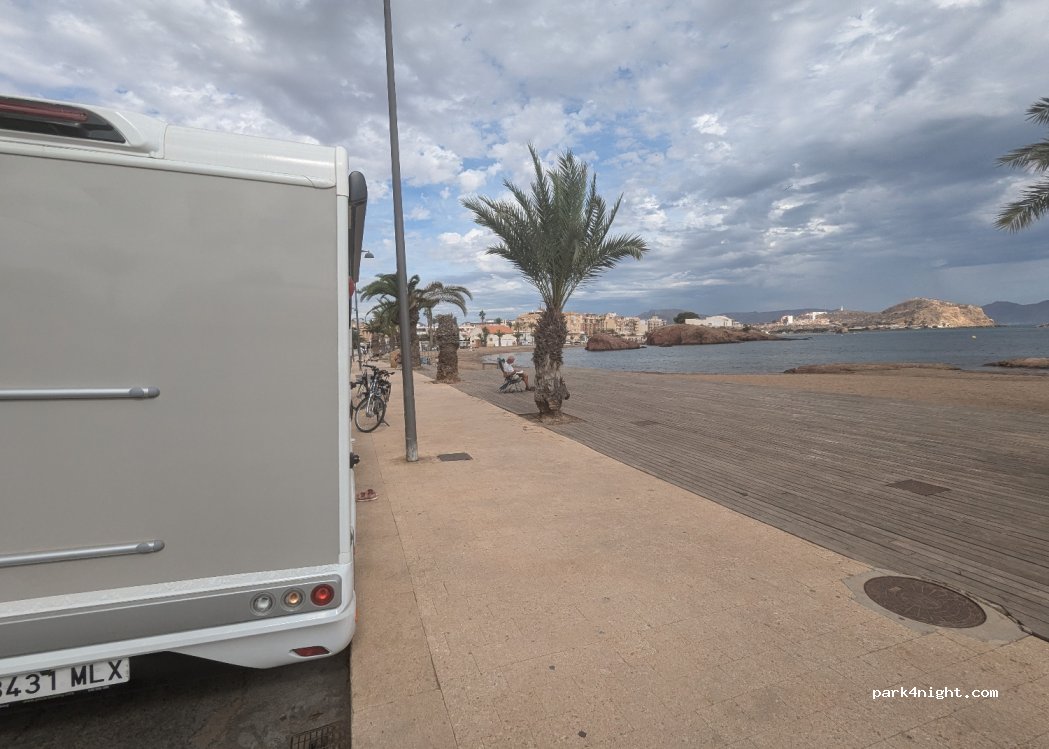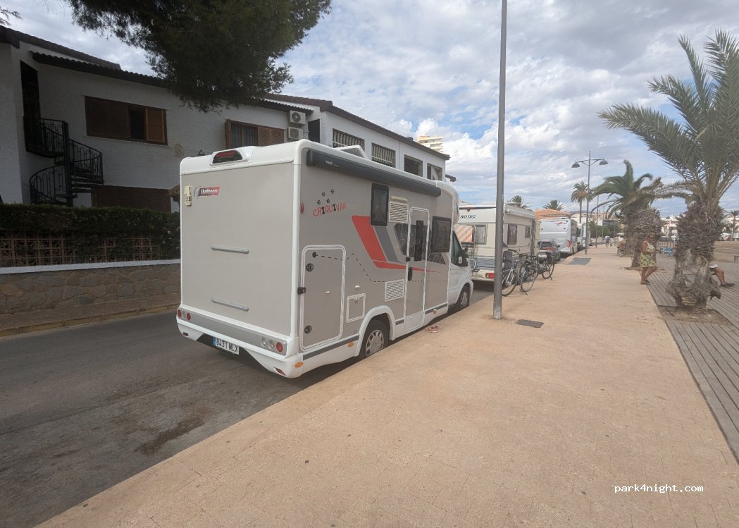 No querría que por mi culpa multaran a nadie, pero no he visto ninguna indicación que prohíba aparcar allí, excepto en alguna plaza concreta y señalizada. Con el debido respeto a los vecinos, hemos pasado una muy buena noche junto al mar. Pocas plazas, un lavabo limpio, pueblo animado. Seguramente inviable en temporada alta.