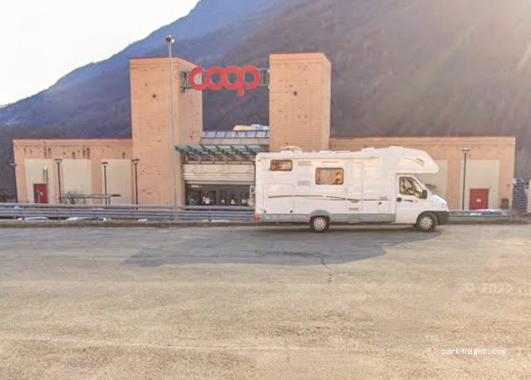 Parcheggio gratuito sopra un supermercato, vista su tutta la valle e a 1100 metri da Perosa Argentina. Non ci sono servizi ma non ci sono cartelli di divieto di pernottamento.