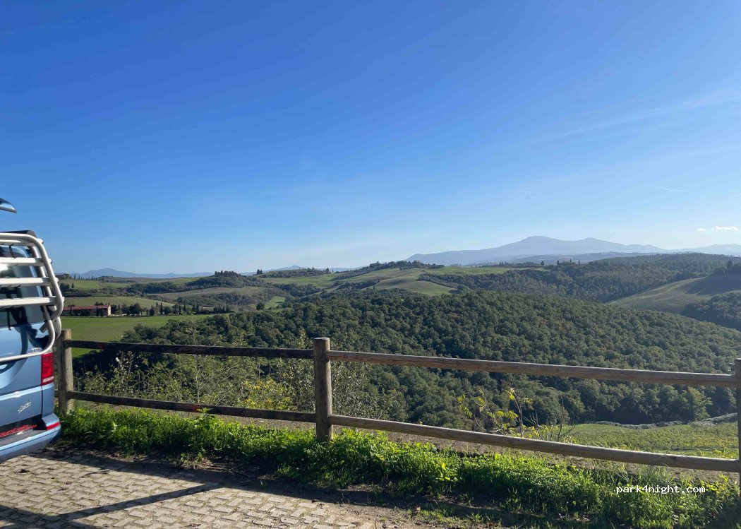 Wunderschöner Aussichtspunkt am Eingang eines kleinen Dorfes (Lucignano d'asso), entlang einer unbefestigten Straße für maximal 1-2 Fahrzeuge. Kein Übernachtungsverbot. Es gibt einen Picknicktisch. Der Weg dorthin ist unbefestigt, aber bequem.