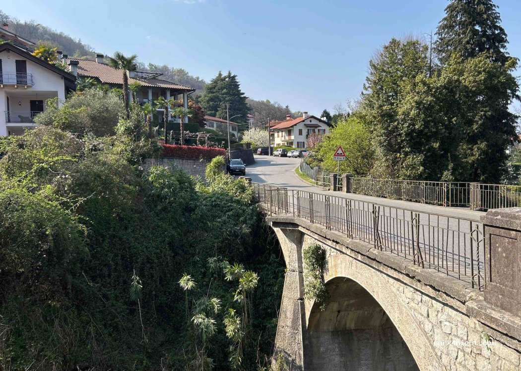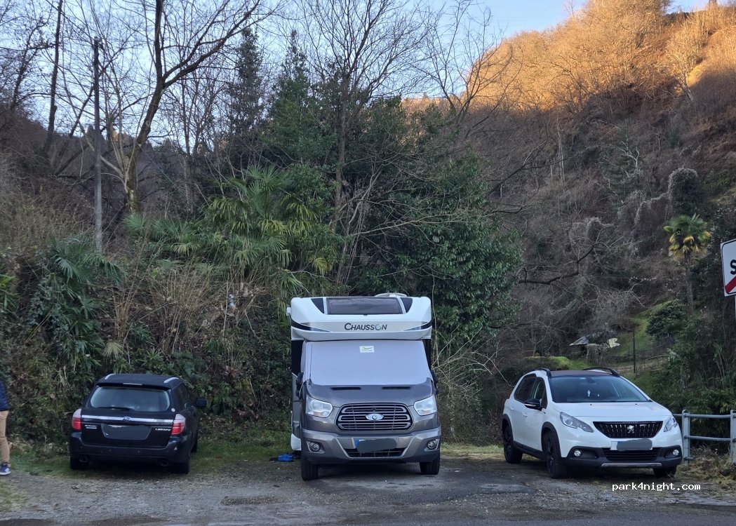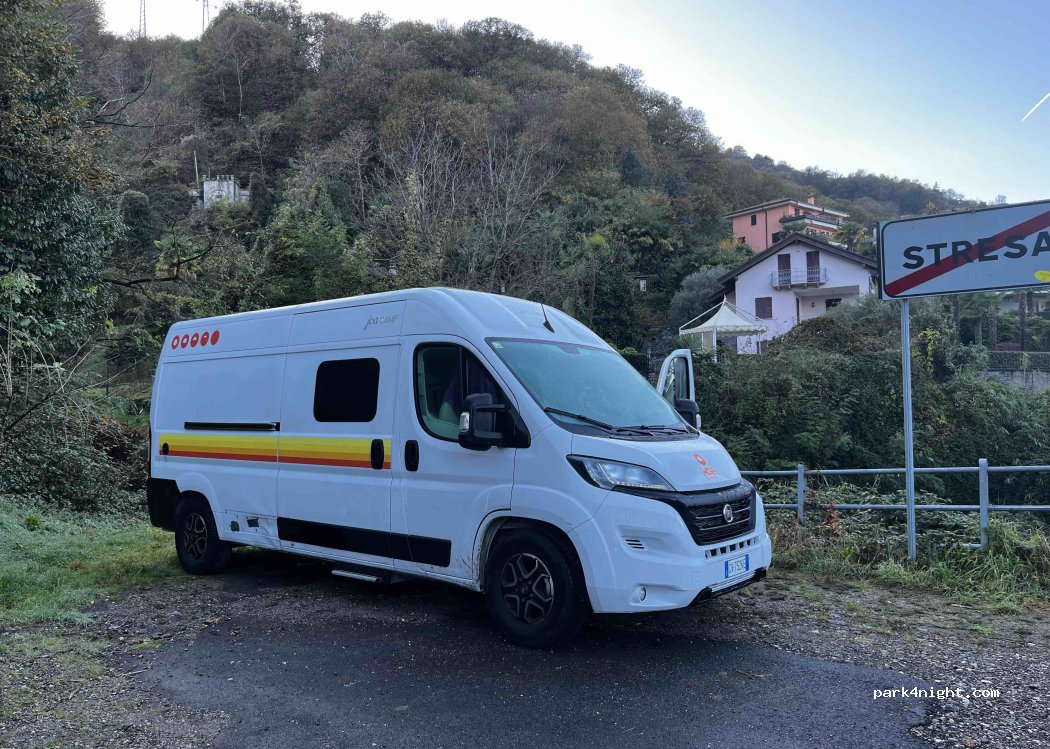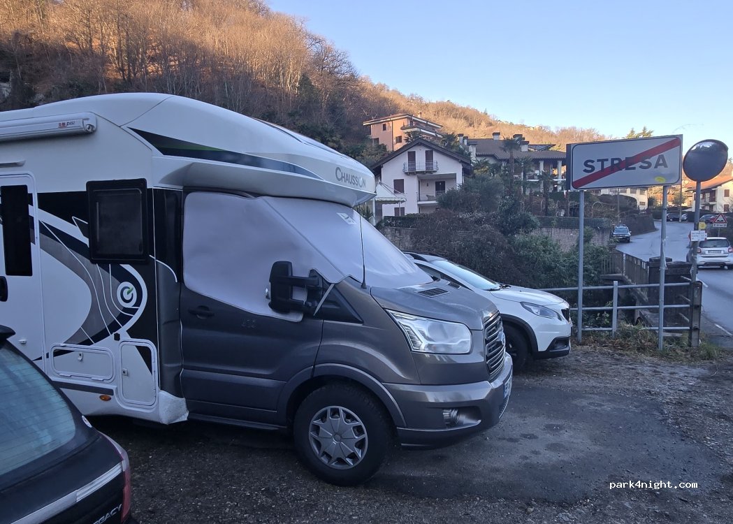 Flat place at the top of the town of Stresa. A river below. We spent a night and a day parked here and no problem. It is 15 minutes from the piers and the town.