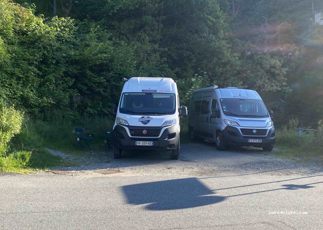 Espace plat pour deux voitures, pas de panneau d’interdiction. Nous y avons dormi une nuit, il y a quand même pas mal de passage de voitures. Proche de la ville.