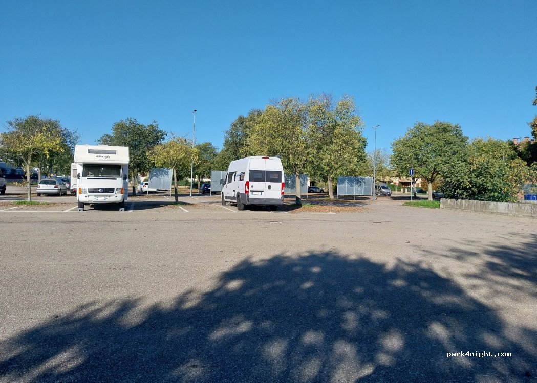 Amplio aparcamiento gratuito, ideal para pasar la noche en autocaravana y visitar los alrededores de Parma. El aparcamiento es tranquilo y cuenta con algo de césped para pasear a los perros. En la pequeña plaza adyacente al aparcamiento hay un restaurante-pizzería, una pizzería de comida para llevar, un bar y una lavandería que funciona con monedas.