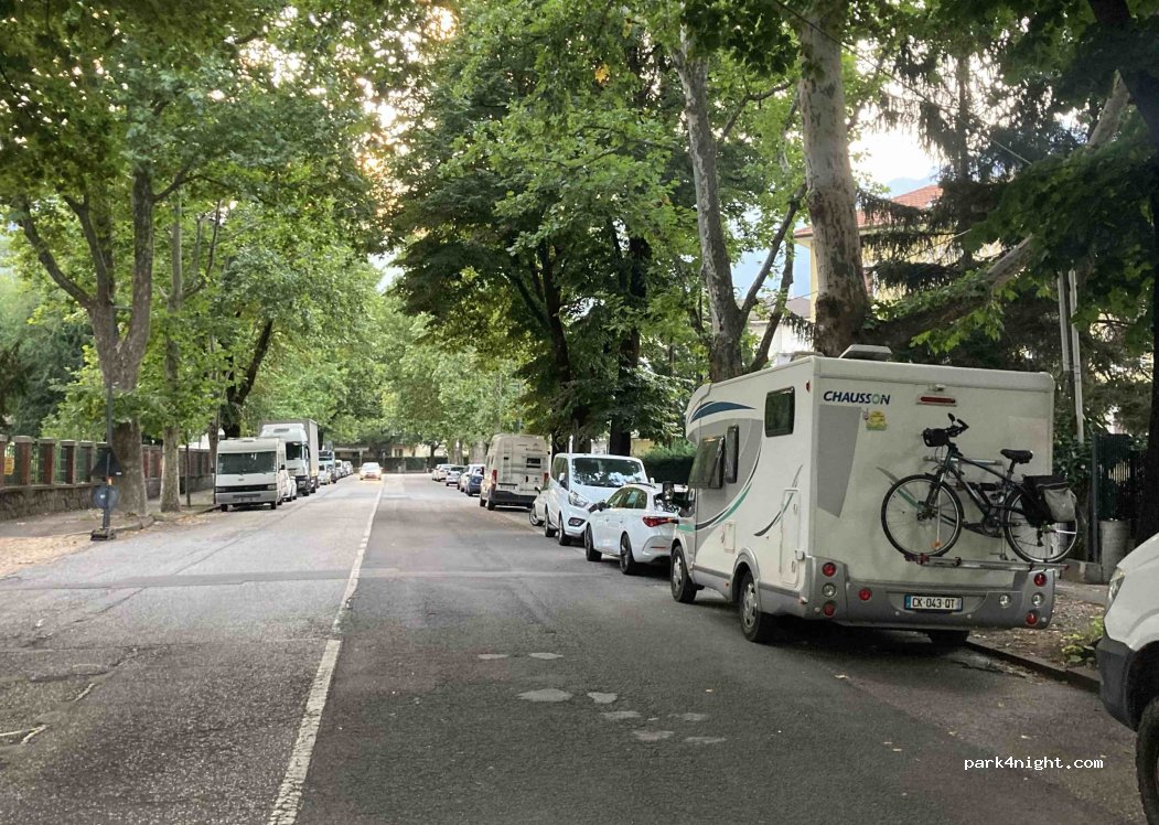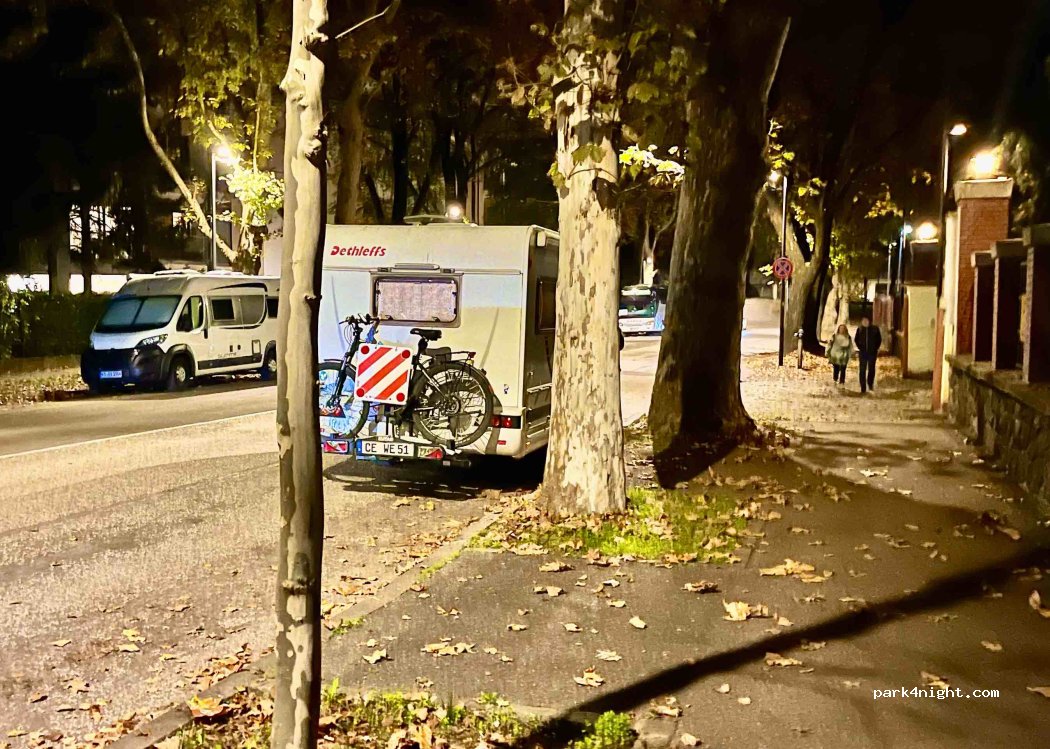 Dans cette rue, il n'y a pas de places de stationnement et il n'y a même pas la ligne blanche continue d'où dépasse habituellement le pneu, c'est pour cette raison que nous nous sommes garés ici sans causer de perturbations. Nous étions plusieurs camping-cars, vans et autocars encombrants. Rue bien éclairée, habitée et avec une clôture militaire à proximité. A 10 minutes à pied de Passirio et du centre