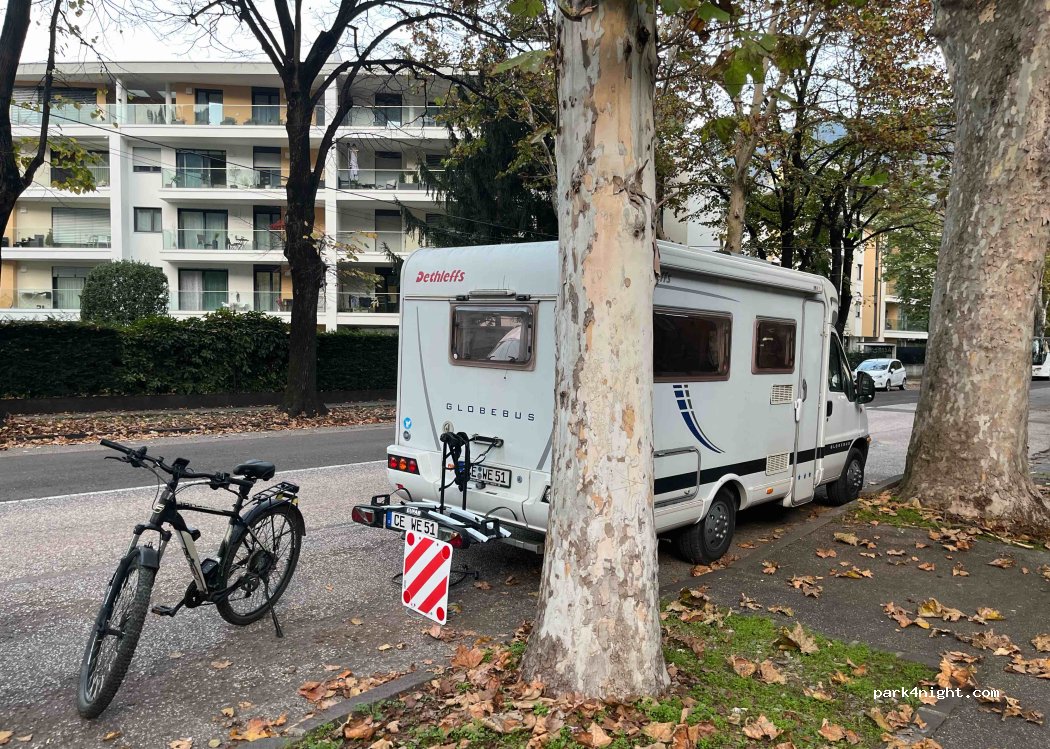 In questa via non ci sono gli stalli per parcheggio auto e non c’è nemmeno la linea bianca continua da cui fuoriesce solitamente lo pneumatico, per questo motivo abbiamo parcheggiato qui senza dare fastidio. Eravamo diversi camper, van e pullman ingombranti. Strada molto illuminata, abitata e con una recinzione militare vicino. A 10 minuti a piedi dal Passirio e dal centro