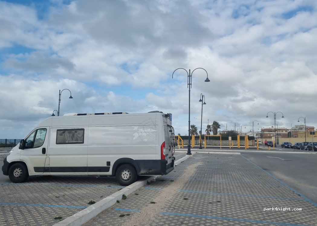 Amplio aparcamiento de pago de 8 a 22 horas con acceso directo por escalera a la playa. Columna de agua con conexión por tornillo y buena presión. Está bien iluminado y se encuentra justo enfrente de la entrada vigilada del cuartel militar. Me sentí seguro a mediados de noviembre.