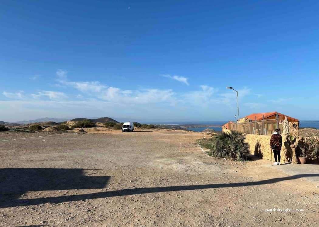 Free flat safe parking right by a lovely big restaurant with a view. We went to ask permission to park and enjoyed a pizza for 40 dirham and two salads for 20 dirham. There is so little camping available north of Nador that this felt worth the detour from the N16.